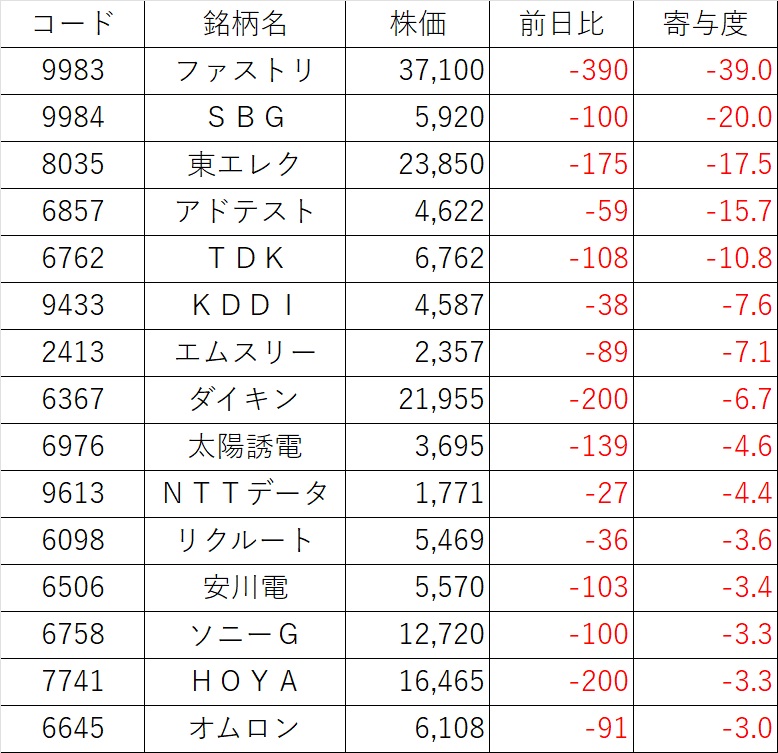 このところの日本株市場、取り分け日経平均株価の上昇がどこまで続くかが議論の的となることがある。たとえば「バブル期の史上最高値38,915円87銭(1989年12月29日)」を超えるのかどうかといった類の話だ。まず最初に断言しておくが、日経平均株価の継続性には非常に疑義があり、その指数が34-35年の時を経て上回るかどうかに本質的な意味は全く無い。また日本の株式市場の時価総額自体はとっくに史上最高値を更新しているのだから、尚更、メディア的なお祭り感しか無いだろう。暇と時間があれば、一度1989年12月29日の日経平均構成225銘柄と今現在の225銘柄を並べて(50円額面換算で値位の高いもの順に並べる(日経平均株価への影響度を知るため))比較してみると面白いだろう。全く別物の指数になっている筈だ。因みに、先週末の日経平均株価は33,431.51円で前日比△55.38円だが、この指数変動への寄与度上位からソーティングしたリスト(TOP15)を作ってみたが如何だろうか。少なくとも最上位のファーストリテイリング(9983)は1989年現在には存在しない。