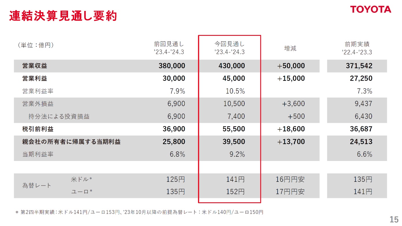 この大前提を知って頂いた上で、現状のバリュエーションだが、PERで見る限り、特に割高感があるわけではない。ただ今期予想PERの算出根拠である為替水準がどこにあるかだけは気になることは確かだ。145円前後なのか、150円前後なのか、はたまたそれ以上に「よりコンサーバティブ」に置いているのか。下記はトヨタ自動車(7203)の今期前提為替の水準が示されている。ドルが141円、ユーロが152円とかなり慎重だ。