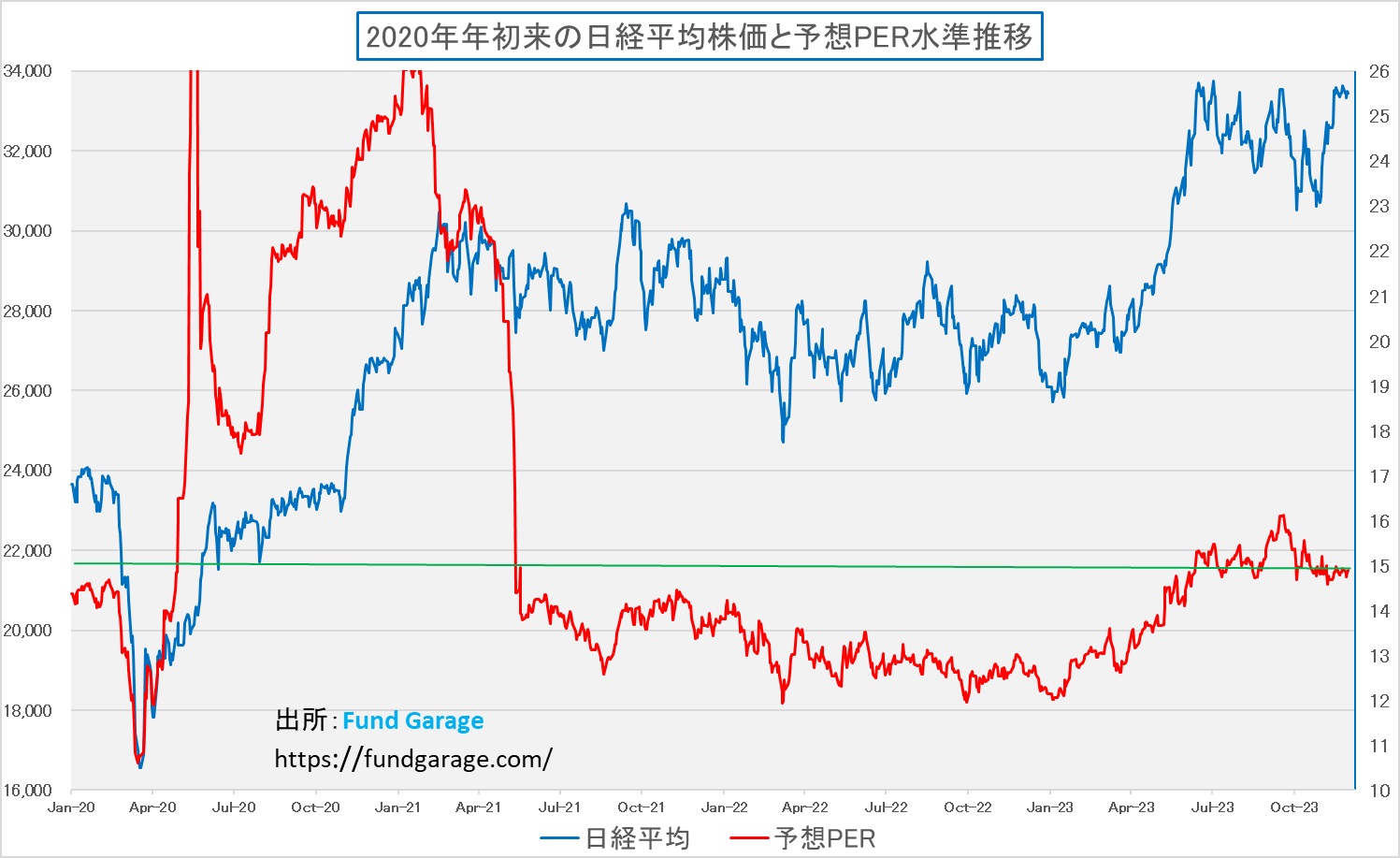 この状況を理解して上で、いつも日経平均株価と予想PERの推移を観るとこんな感じ。決して「割安感際立つ」とは言わないが、「買われ過ぎ」という言い方は全く出来るれべるではないことがわかる。