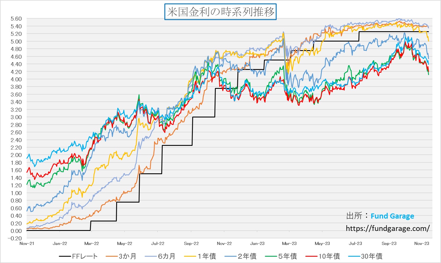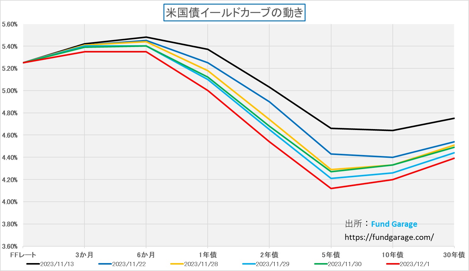 「米国の長期金利が5%台に乗りそうだ」と危惧したのは僅かひと月半程度前の10月中旬ことだが、あの頃の勢いは何処へ行ったのか、今は正反対の動きとなっている。寧ろ、あまりも急激な金利低下のスピードに個人的には驚きを禁じ得ない。この週末の10年債利回りは4.200%と、10月末の4.930%と比べると、0.730%も低下したことになる。これは日本の長期金利とほぼ絶対値は一緒だ。因みに、日本の新発10年債の週末の水準は0.700%、その前日11月末の水準は0.660%に過ぎない。まず時系列チャートからご覧頂こう。期間の長い(「デュレーションが長い」とも言う)金利ほど低下しているのは一目瞭然だろう。