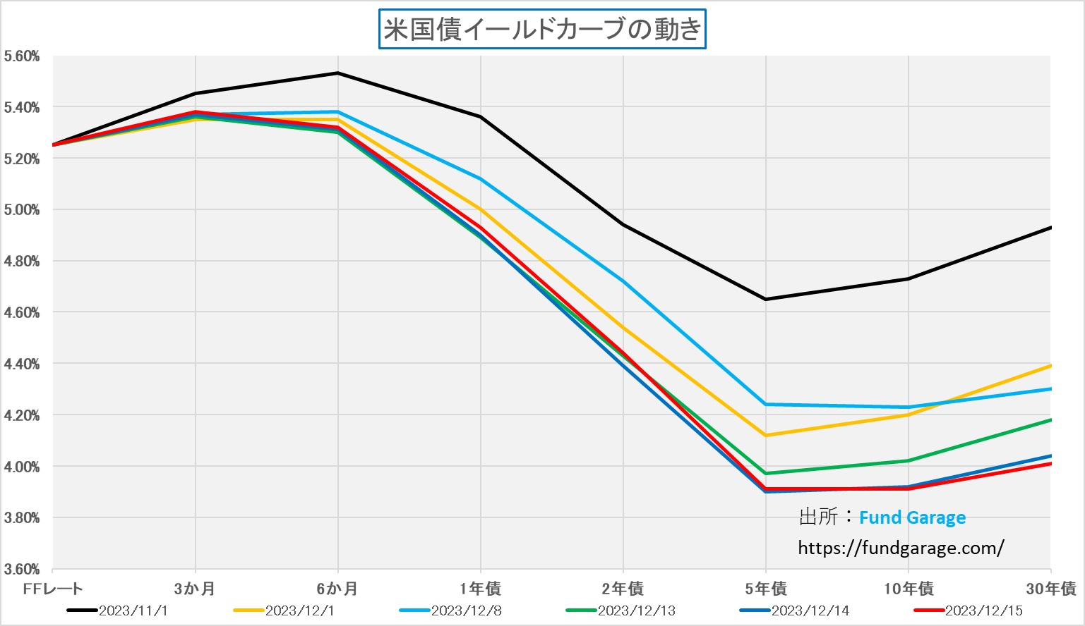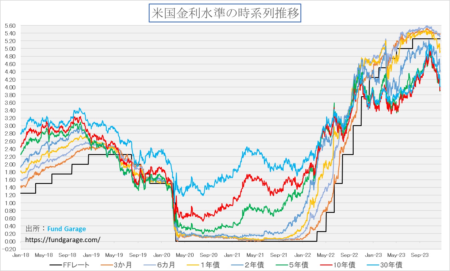 下記チャートが短期金利よりも長期金利の水準の方が高い正常に順イールドだった頃のもの。2024年末の予想水準(FOMCメンバーが適正だろうと考えている水準)が4.60%ならば、10年債利回りはイールドカーブが仮に水平だとしても、現状よりも0.7%近く上昇して4.60%以上で無いとならない。だが実際の週末の金利水準は10年債利回りで3.91%、この分(約0.7%近く)は、より利下げ回数を多くする(0.25%ならば、あと3回)を見通すか、長期金利をその分跳ね上げさせるかしないとおかしな状況となっている。反対に、逆イールドが意味する本来的な意味として「景気失速予想」を是とするならば、それはFRBの思惑とはだいぶ違うことになる。どこでどう、FRBと市場が折り合いをつけられるかが来年2024年の愁眉の急となるだろう。何せ、2024年は大統領選挙イヤーなのだから。