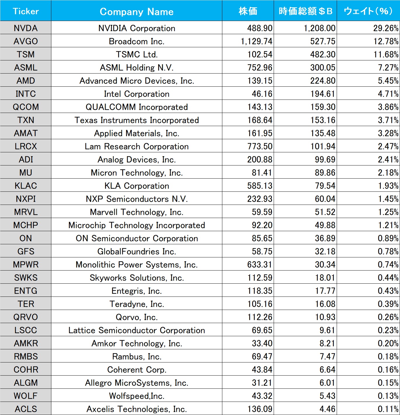 フィラデルフィア半導体指数ことSOX指数がベストパフォーマンスだったと言われてもピンと来ない人は、恐らくエヌビディア(NVDA)を見ている人だと思われる。かく言う私自身もその一人だが、それはこの指数が時価総額加重平均型の指数であり、その最大ウェイトの銘柄がエヌビディア(NVDA)だからだ。そのエヌビディアがあまり値上がりしていないのに、なぜSOX指数がベストパフォーマー?なのかと素朴に思われたのだろう。最新のデータでSOX指数を時価総額の順にソートして一覧表を作ってみた。ご覧頂ける通り、30銘柄で構成されるこの指数、実はその約3割をエヌビディア一社が占領している。