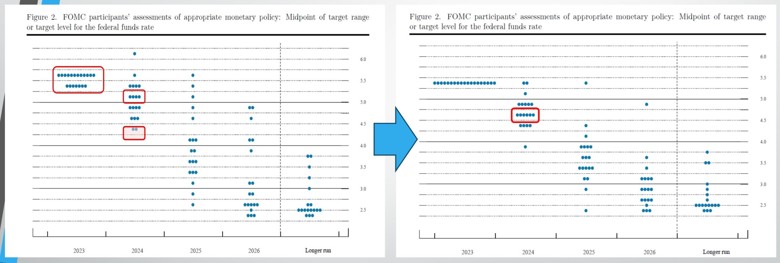 ならば肝心のFOMCでは何がどうなったのかと言えば、事前の予想通り、今回も利上げは見送られた。更に、3カ月毎に発表される経済見通しについても概ね市場が想定していた通りの内容となった。その結果、この先の政策金利見通しをFOMCメンバーが個々に予想してマーキングしている「ドットチャート」では、2024年末のFFレート水準が0.75%程度の利下げが想定されていることが判明した。これを米国株市場は好感したわけだが、実際には当初市場が期待していた2024年の利下げは5回程度、すなわち1.25%~1.50%だった筈なので、本来は若干期待外れだった筈だ。実際、金利先物市場では3月から6回の利下げ(0.25%×6回=1.5%)が織り込まれている。またドットチャートに示されたFOMC参加者個々の予測にはばらつきが大きいことが見て取れる。8人は「0.25ポイントの利下げが3回未満」とみている一方、5人は「それ以上の利下げ回数」を予想していることが分かる。下記左側のドットチャートは9月の時の予想、そして今回右側のドットチャートへと変化した。一目瞭然だが、2024年末の金利予想の中央値は4.50%~4.75%のところとなるが、その上にドットが8つあり、逆にこのゾーンの下にドットが合計5つある。つまり上の8人は利下げは2回と見ており、下の5人は利下げは4回以上と見ているということだ。