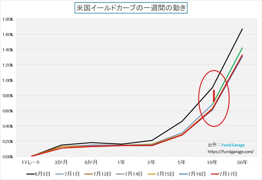 どの程度にその姿が歪かということは、下記のチャートの作り方でイールドカーブの状態を見て貰えればよくわかる。黒線が先月のFOMCの時、黄色が12月1日となる。水色は先週末12月8日で、緑がFOMC当日の13日、紺色が翌14日、そして赤色が先週末15日だ。ご覧頂ける通り、FFレートの誘導目標は変化しないままに長期金利がこれほどまでにどんどんと低下している状態をどう評価したら良いのだろうか。参考までに、さらに一段下に2020年7月19日号のプレミアムレポートに掲載したイールドカーブの状況も続けて掲載しておく。通常はこの形(デュレーション(期間)が長い金利ほど、利回りが高くなる)のが「正常」な金利の期間構造なので、今がどれだけ異常なのかを見て欲しい。どう小理屈を便宜的につけてみても、必ずこれはどこかで是正される。