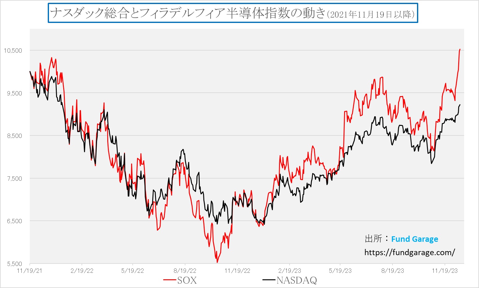 NASDAQとSOXを比較すると、下記のチャートのようになる。驚くほど、SOX指数の方が動きが良いことがわかる。