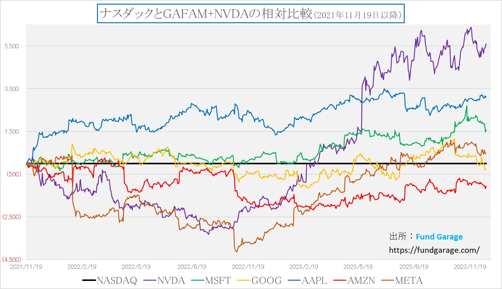 ならばということで、このチャートを見て貰えば、その理由も分かると言うもの。このホリデーシーズンに入ってから、マグニフィセント7などと呼ばれる大所はポジション整理(ニュートラルにするため)もあって、パフォーマンスは上がらない。それは既報の通り。その結果を如実に証明しているのがこのチャートだ。対NASDAQ総合指数への相対パフォーマンスだが、面白いことに、それでもエヌビディアは健闘しているようだ。そしてMSFT、GOOG、META、AMZNに個別の悪い話は何もない。だとすれば、来年のマーケットは楽しくなりそうだと思えてしまう。