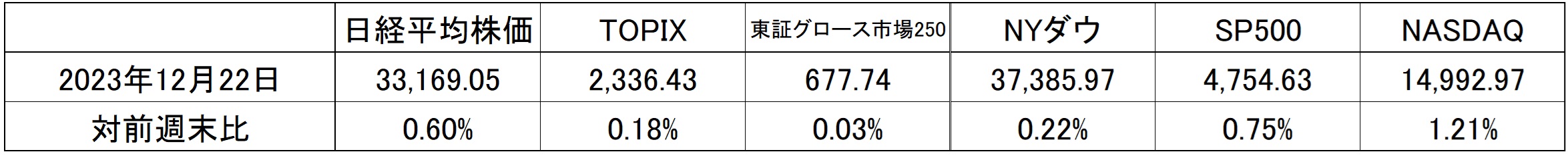 更に、地政学リスクにもずっと怯えたとも言える。新たにハマス・イスラエル問題までも勃発し、現状ウクライナ問題含めて解決の糸口は掴めていない。また日本国内では、永田町のゴタゴタも嘆かわしい限りであり、よくぞここまで日本の株式市場も健闘したものだ思えるほどだ。日本経済への影響ということを考えると、ダイハツ工業の不正問題は、自動車産業の裾野の広さを考えると、間違いなく「個別の会社の問題でしょ」と看過出来る話では無いだろう。ただそれらの問題を全てこなして日経平均株価は年初来で27.11%もの上昇となった。これはS&P500を3.3%弱、TOPIXを3.6%上回る結果となった。つまり米国市場全体の動きと一般的に言われるインデックスよりも良好なパフォーマンスを挙げたという意味だ。更に言えば、NYダウに対してはその2倍上のパフォーマンス、14.32%ものオーバー・パフォームだ。当然、これにはTOPIXの上回っているので、今年は日本株市場の方が米国株市場よりもパフォーマンスは良好だったことになる。ただ、その一方で、NASDAQに比べると△16.14%も大きくビハインドとなる。付け加えるとすれば、2023年1月3日のドル円相場は131.04円なので、先週末142.41円の水準で評価すれば、為替メリットの8.68%も上乗せされるため、NASDAQへの投資家は日経平均への投資家に比べて、更に上乗せされて、トータルで約52%も運用収益をあげている計算になる。