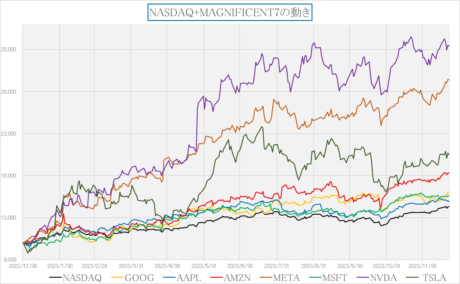 そこでもうひとつ状況を見極める為に、集中のし過ぎなどと揶揄された「MAGNIFICENT 7」こと、グーグル(GOOG)、アップル(AAPL)、メタプラットフォームズ(META)アマゾンドットコム(AMZN)のGAFA、プラス、マイクロソフト(MSFT)、エヌビディア(NVDA)そしてテスラの7銘柄の年初来の動きを見てみよう。