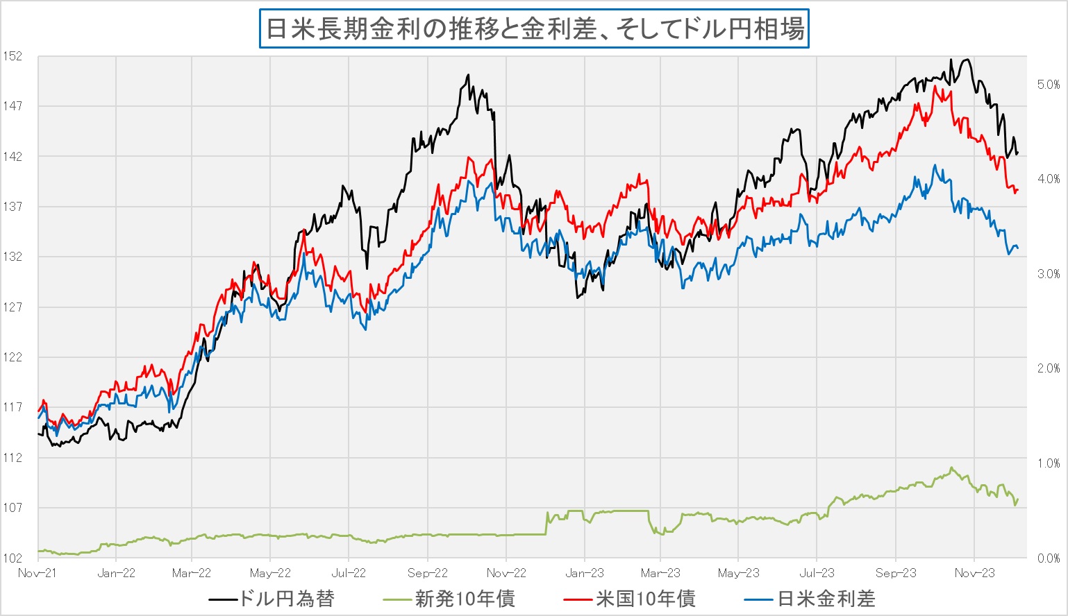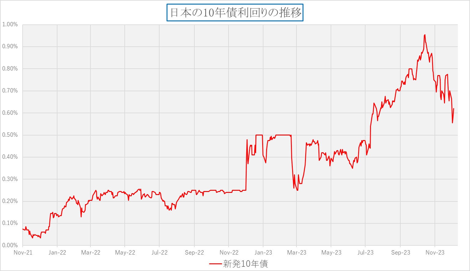話を本筋に戻す。実は下のチャートで確認出来る日本国債の新発10年債利回りの現状こそ、大きな問題だと考える。日本の長期債利回りが直近でピークとなったのは前回10月30日、31日に開催された日銀の金融政策決定会合直後だ。そう、YCCの運用がより弾力化され、無制限の債券買い入れ目途が1%に引上げられた時だ。ただ、チャートが示すように、1%近くにまで長期金利が跳ね上がったのは、後にも先にもその刹那だけ。その後はズルズル金利は下げてくる。一旦戻りかけそうになったのは、前述「参議院 財政金融委員会」での植田総裁の「チャレンジング発言」を聞いて、「日銀は早ければ年内か年明けにマイナス金利解除へ」と、その時期にまで言及するような憶測が飛び交い、それが当然と言わんがばかリのムードになった時。そして結局金融政策決定会合で現状維持が発表されると、金利は手のひらを返すか如くに更に急低下して0.55%にまで下がっている。この理由を冷静に債券市場の周りにいる人達は素直に考えるべきだろう。