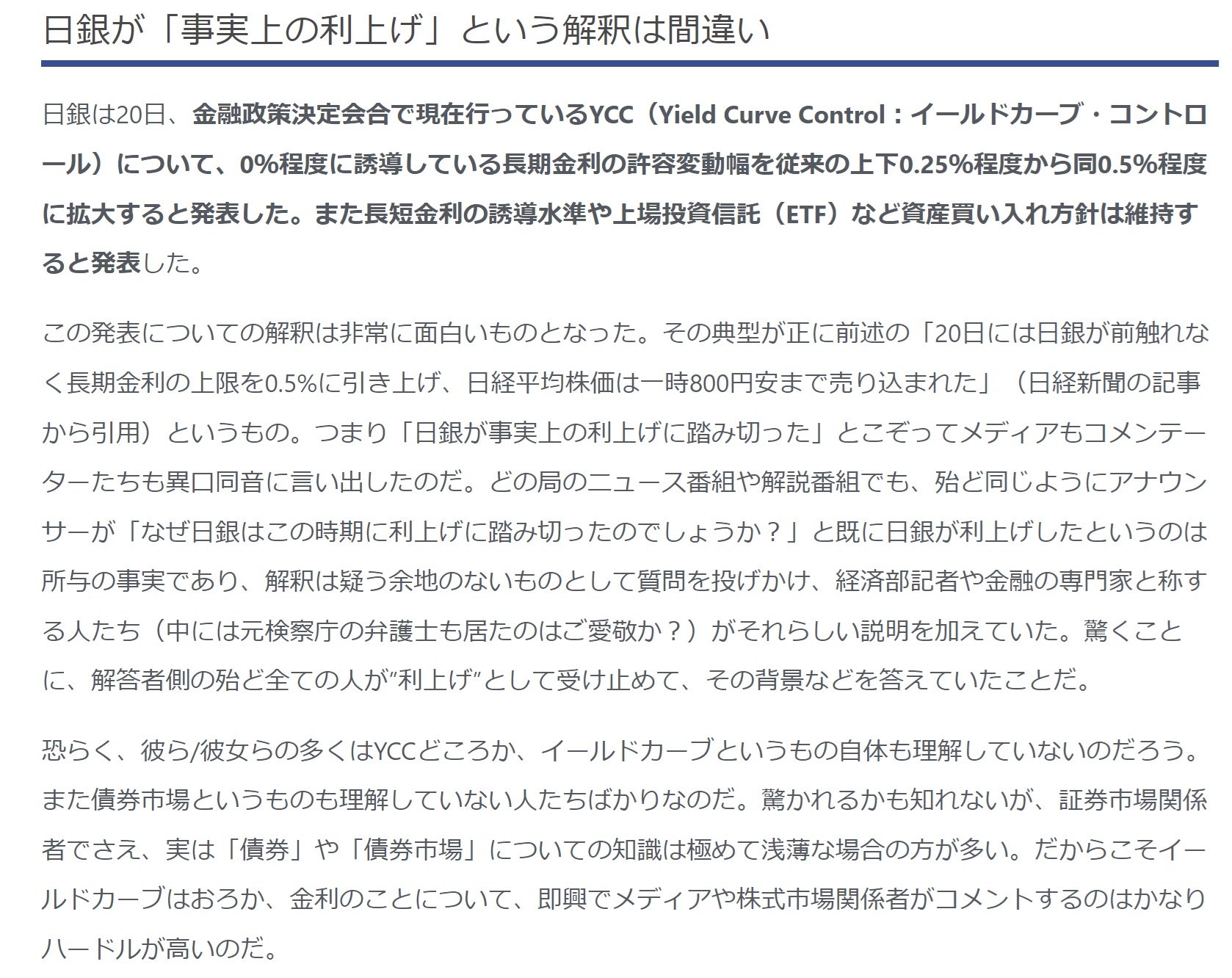 そもそも普通に中学校の「現代国語」レベルの日本語読解力があれば、植田総裁の「チャレンジング」という言葉の意図は(利上げやマイナス金利解除を企図したものとは)違うことは普通に分かる筈だ。だが、やはり言葉というのは難しいもので、聞き手の思い込みが激しいと全く別のものに聞こえたり、解釈してしまったりする。思春期から青春時代、想いを寄せる異性の何でもない発言に盛り上がったり、落ち込んだりした経験があれば、この意味もお分かり頂けると思う。ただ予てからいつもお伝えしているように、メディアの報道というのは、どうしても「欲しい文節や単語」を「言質」として切り取り、大袈裟に包んで伝えるものだ。だからこそ投資家は冷静に全文を把握するか、「そうしたものだから」と割り引いて聞く癖をつけるべき。自分自身で直接原典をあたれない/あたらないのであれば、話八割なんてレベルではなく、三割から二割にまでまで割り引いて置くべきということだろう。
