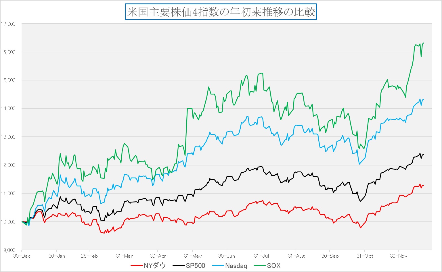 ならば何が成長ドライバーの中心にあったのか、何がその株価上昇の原動力なる「ビジネストレンド」だったのかといえば、それは敢えて言わずもがな「AI」関係だ。それもマイクロソフト(MSFT)のOpenAIへの数十億ドルの投資という話でキックオフした「生成AI」の分野だろう。下のチャートは米国株の主要株価4指数の年初来の比較推移チャートだ。全て昨年末を10,000ptsとして指数化してある。予想に違わず、パフォーマンスは上から順番に①SOX指数(フィラデルフィア半導体指数)=16,321.80、②NASDAQ=14,324.75、③S&P500=12,383.46そして④NYダウ=11,278.75の順番だ。各指数の後ろの数値が先週末現在の水準を示している。驚くのはNASDAQの43.25%をも更に上回る勢いでSOX指数が爆謄していることだ。これこそ「AI」、それも生成AIの中心をなしたエヌビディア(NVDA)のGPUが中心だろう。ただ、実は後半の上昇にはエヌビディアはあまり貢献していない。取分け、11月以降の上昇にはあまり関係ないかも知れない。