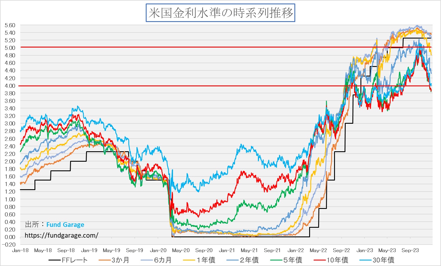 念のため、下記のチャートで現状の米国金利の時系列推移を確認しておこう。ご覧頂ける通り、かなり米国の市場金利は政策金利に比べて低下していると認めざるを得ない。