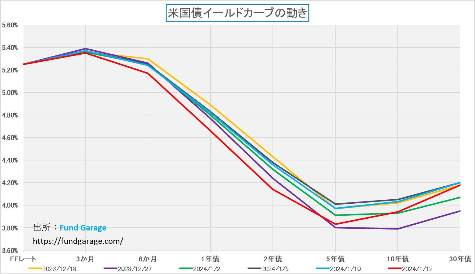 下のチャート、いつものイールドカーブで赤線が週末のそれを示している。まず紫で示した12月27日の線、これが昨年末の最楽観シナリオを反映した動き。だが、年明け1月2日の取引では緑の線の水準まで押し戻されて、更に前週末1月5日には黒い線のところ、ほぼほぼ12月のFOMC直後の水準まで押し戻された。そして、先週水色で示した1月10日までは早期の利下げ期待は修正されているかに見えたが、残念ながら、CPI(初期反応は利下げ期待が遠のいたのだが)とPPIの内容によって再度期待が高まっている。取分け、PPIの発表を見た市場は2年債利回りを4.14%まで買い上げてしまっている。
