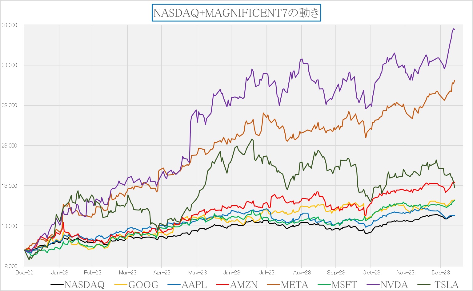 もうひとつ明らかにテスラが他の6社と異なる存在であることを証明するのがこのチャートだ。真ん中の濃い緑の線がテスラ(TSLA)のCY2023の株価運びだが、明らかにマグニフィセント7の他の6銘柄とは動き方が違うのが確認出来る。
