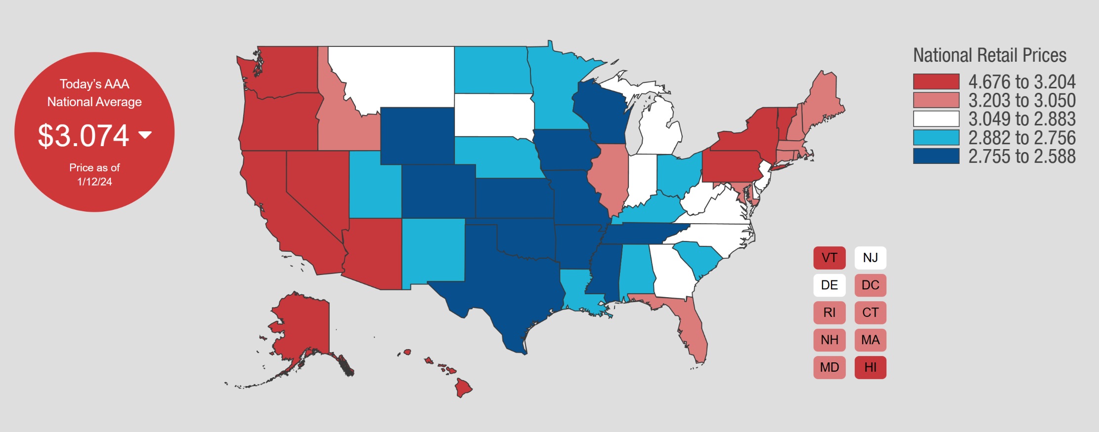 一方で、やや問題かも知れないと思われることは、すなわち「そんな簡単にCPIが今後も利下げの(強い)根拠とはならないだろう」と思えてしまうのは、下のチャートが示すガソリン価格のトレンドにある。これはAAA Gas Pricesのウェブサイトにある、ガソリンの全国平均価格の年次推移をまとめたものだが、実は既にガソリン価格は充分とは言わないまでも、2022年の高値からはそれなりに低下しているからことがわかる。現在全米平均は3.07ドル/ガロンだという。ここまで低下した後だと、対前月比で「大きな数値」になるように価格下落がこの先も継続的に進むという確率は当然にして低くなるからだ。ここは冷静に判断した方が良いポイントだ。