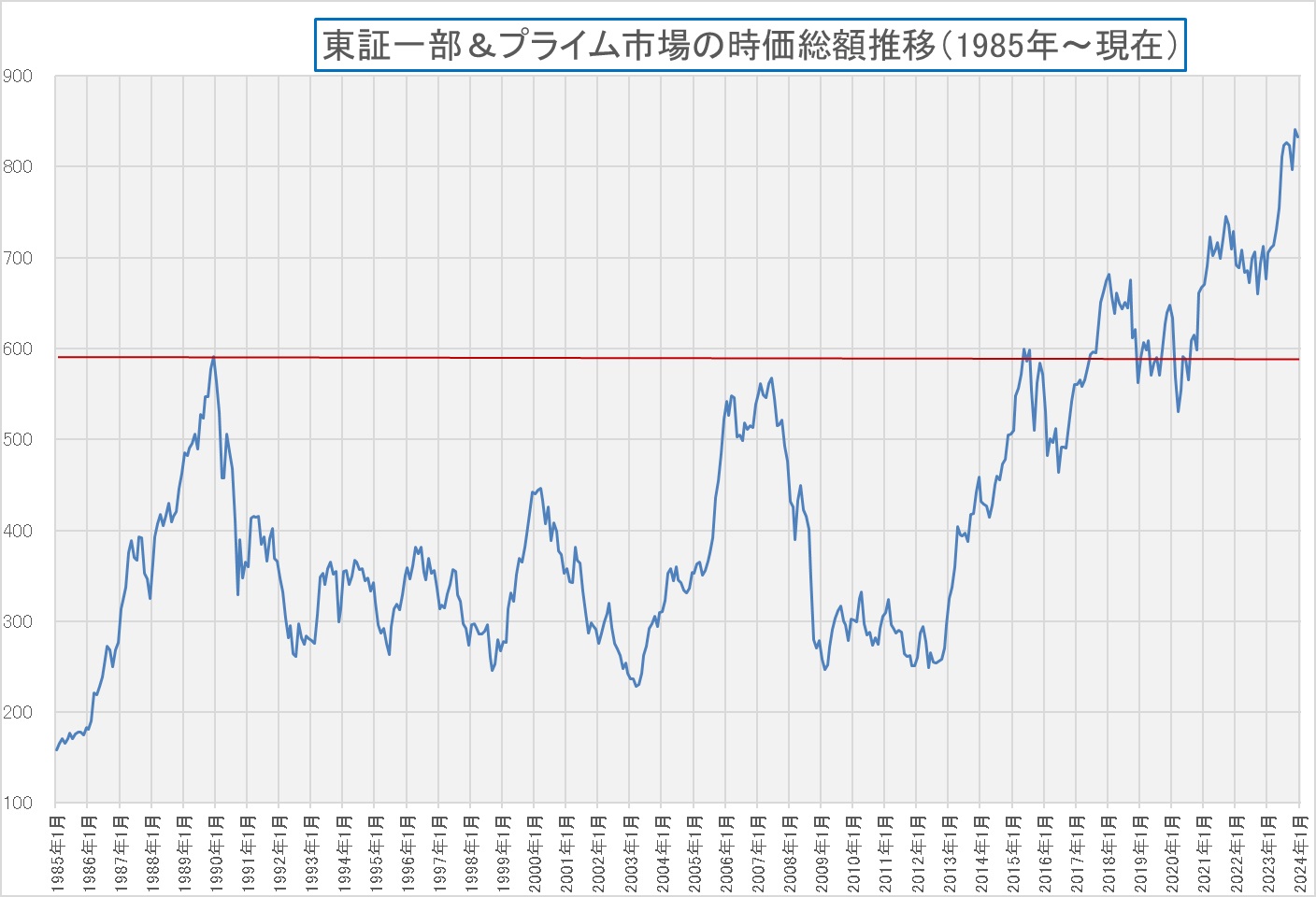 では、現在の日本株式市場の水準が1989年のバブル当時と比べてどの辺りにあるのかというと、一番正しくその状況を示すのは、下記のチャートだろう。すなわち、東証1部、そして現在はプライム市場と呼ばれる市場の時価総額推移だ。ご覧頂ける通り、赤線を横に引いた1989年12月末の日本株式市場の時価総額は591兆円であったのに対し、2023年12月末現在の時価総額は833兆円と既に41.0%も増加している。直近の時価総額にはスタンダード市場、グロース市場、そしてTokyo PRO Marketは含めていないので、新規上場企業の増加分は排除されているだろう数値でこのレベルに及ぶ。