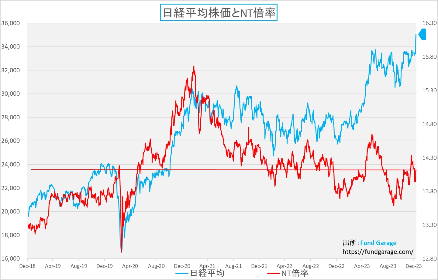 従って「年明けから際立つ、日本株の強さ。 背景にあるのは、「アメリカの株高」と「円安」です」という説明も、どこかピンと来ない。寧ろ、私の実感から言えば、日経平均で語られる程に、日本株の年明けからの動きは強くない。その背景を説明しよう。恐らく、グダグダ説明するより、下のチャートがその意味を端的に証明している。つまり日経平均株価を東証の時価総額加重平均から計算されるTOPIXで割った指数であるNT倍率の推移だ。