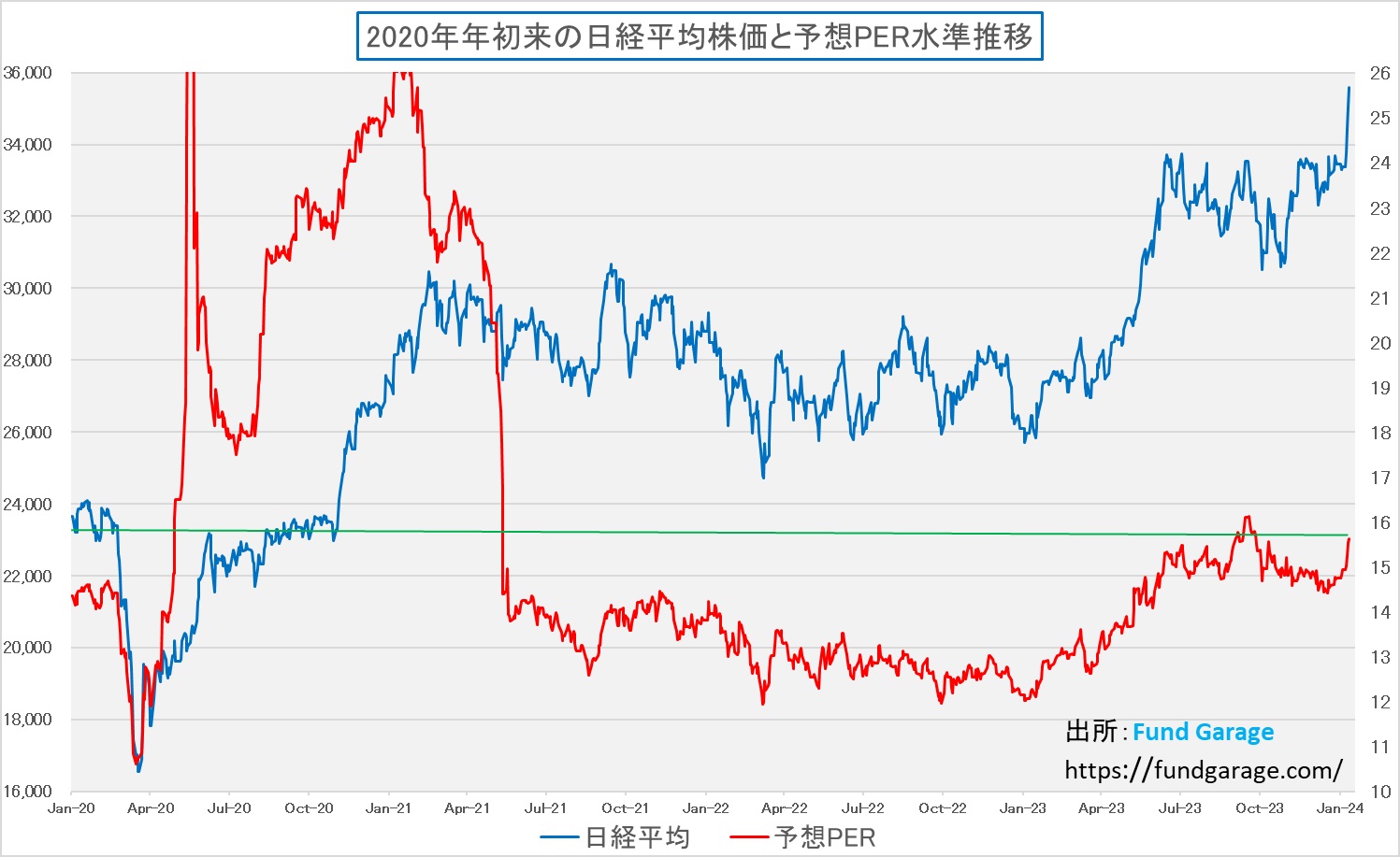 あまりコメントするのも気乗りしない話題ではあるが、日本の株式市場の動向としては非常に注目を集めている話なので触れないわけにはいかないだろう。報道などでは「今日で4日連続、終値でバブル後の最高値更新」 などと先週末の日経平均株価の終値が前日比527円高の35,577円をつけたことに湧いていたが、確かに日経平均株価指数という株価指数の歴史としては、1990年2月以来、33年11か月ぶりの高値で、1989年につけた史上最高値38,915円に近付いてきたのは事実だ。ただ以前にもお伝えしたことがあるが、この株価指数自体は銘柄入れ替えが定期的に行われていることもあり、ハッキリと1989年当時の内容とは別物なので、その指数の水準自体には連続性からしてあまり意味が無い。勿論、日経平均株価をベンチマークとするインデックス運用の商品、すなわちインデックス投信やETFは、その指数構成銘柄の変更に併せて一緒にポートフォリオを変更するので、これらのホルダーにとっては意味があるのは事実だ。