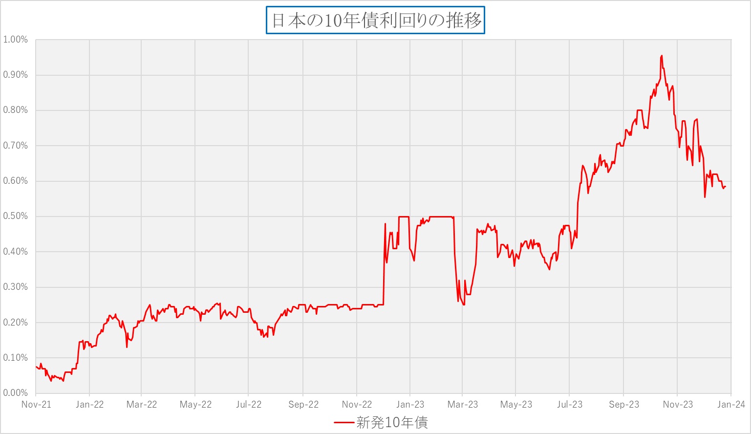 日銀が本当に「マイナス金利解除」の方向を目指しているかどうかは別として、現状の日本の長期金利推移を確認しておくことには一定の価値がある。先週末の終値は0.585%と昨年12月20日に付けた0.555%には及ばないものの、年初来の水準で言えばほぼ最安値にある。また短期国債、中期国債、そして長期国債と年限別に利回りを確認しても、順イールドになっており、特定の残存期間が凹んだり、凸になっていたりはしていない。「市場は日銀のマイナス金利解除を見込んでいる」とは報道されるが、このチャートからは、その気配は感じられない。