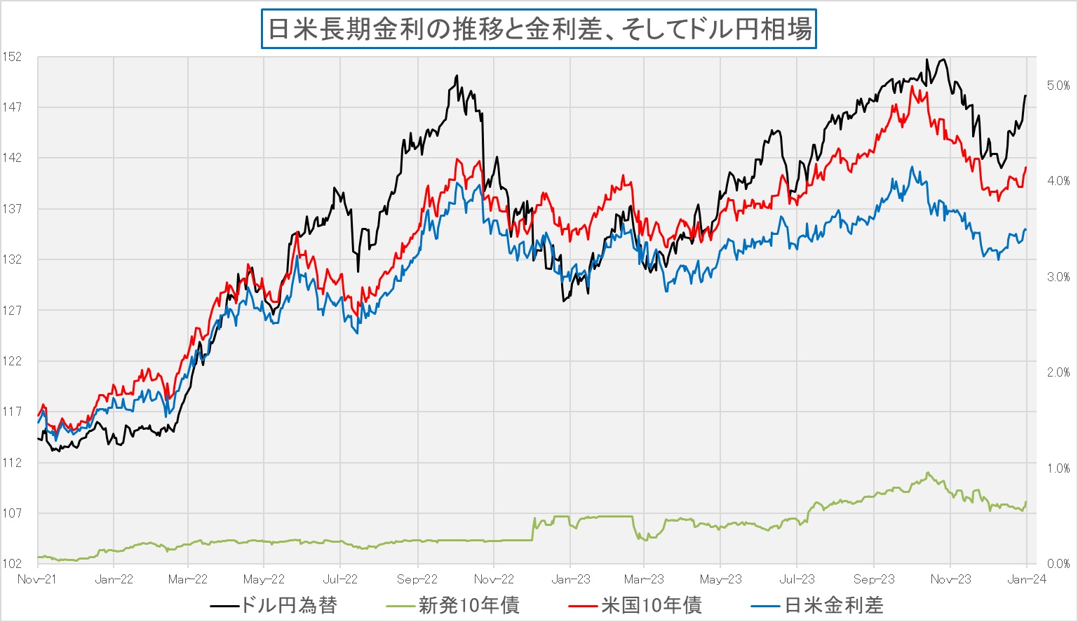 恐らくこれは投機筋などのポジション調整などによる、需給要因の方が強いものと思われる。シナリオとしては、従来は米国側の早期利下げ期待と、日銀のマイナス金利解除という流れだった。それにより金利差縮小から一旦は円安も収まり、円高を見込むということで、昨年末は一旦141円台にまで突入した。だが年初の能登半島地震により、日銀が金融緩和のマイナス金利を解除するのは難しくなり、一方の米国では、次回1月30日─31日に開催されるFOMCを前に、連邦準備理事会(FRB)理事らは公の場での協議が行われないブラックアウト期間に今週から入ることもあり、先週は随分と最後に縷々コメントされていることが多くなった。それらが近々の過度な利下げ期待に水を差すものであったため、当初のポジションを巻き戻す動きと言うこと言えるだろう。