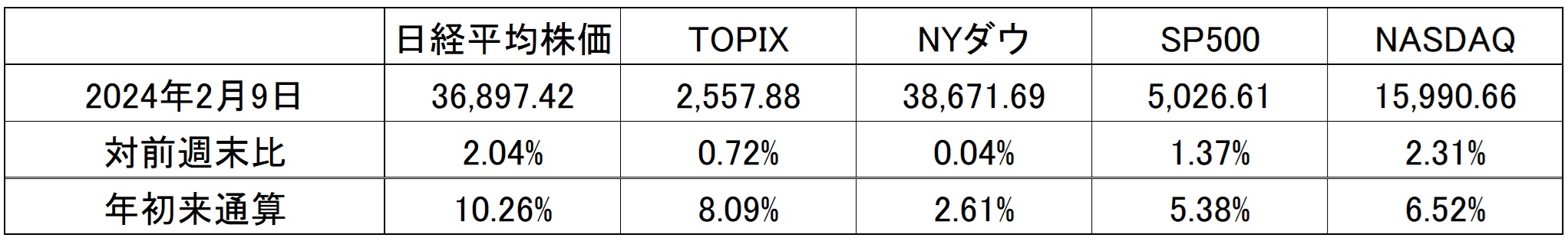 このチャートを見て貰えば一目瞭然なのだが、実は先週末時点において、NASDAQは2021年11月19日につけた史上最高値16,057.44を未だに更新出来ていない。先週末の終値は15,990.66だ。勿論、間もなく新高値を更新するとは思うが、これだけ活況を呈し、AI関連銘柄、半導体関連銘柄と言われるもの、それこそがNASDAQを最も象徴しているかの銘柄の株価が上位に集中して上昇しているといっても、2年3か月前につけた高値を未だに更新出来ていない。寧ろ、そうしたテック銘柄がその影響を半減させているS&P500や、そもそも指数の計算ロジックが根本的にことなるNYダウの方が、史上最高値を更新している。参考までに、2021年11月19日を10,000として再計算した場合、先週末2024年2月9日現在のNYダウは10,862.23、S&P500は10,699.56、NASDAQは9,902.036そしてSOX指数が11,675.04となっている。つまり、+8.62%、+7.00%、△2.04%そして+16.75%ということだ。
