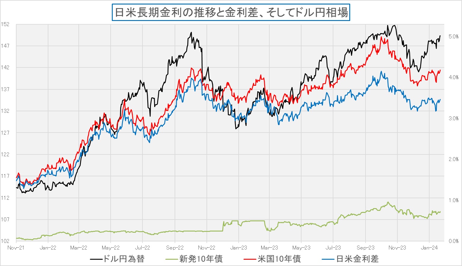 早期の利下げ期待が強かった頃(昨年末前後)は、金利も3.8%程度にまで低下し、為替相場も一旦は1ドル141円台までドルが売られもしたが、結局は週末のドル円相場は149円台までドルが買い戻され、円安が進んだ。だが、下のチャートを見て貰えば明らかな通り、足許では日本の長期金利が殆ど安定して動かないことも手伝い、米国10年債利回り、或いは日米金利差が同じように為替相場の指針になっているかに見える。今週火曜日にはCPI(消費者物価指数)、そして木曜日にはPPI(生産者物価指数)が発表される。恐らく余程「サプライズ」な内容とならない限り、次回のFOMCでの金融政策スタンスに変化は起きないだろう。直近発表されている他のマクロ統計から推察してインフレが急伸している可能性も低いが、逆にある程度物価が安定していたとしても、それはFOMCメンバーに現状の政策が正しくワークしていることの自信を与えることにはなっても、利下げを早めるものとはならないからだ。それがパウエル議長がコメントされた内容だ。