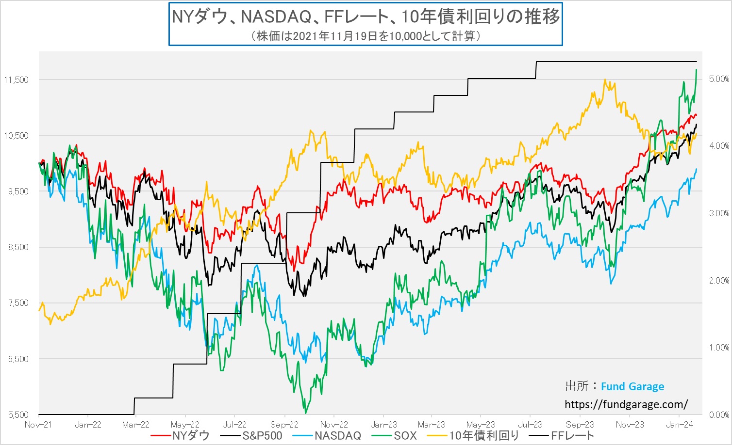 そこで下のチャートの登場となる。これはいつもの通り、米国株の主要株価3指数にSOX指数を加え、そしてNASDAQが史上最高値をつけた「2021年11月19日」を起点として10,000ptsに換算し直し、その後の推移について、それぞれ色を変えて示したもの。そして更に黄色の線で10年債利回り、黒い線でFFレートの推移を右軸に数値をとって示している。