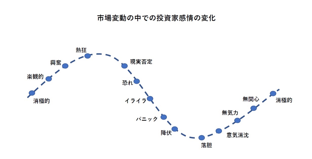 ただ1988年から市場に携わり、その後に「バブル」と言われた時期を数度以上経験してきた身としてはっきりと断言出来るのは、「バブル」と悲観的なことを言う人達がたくさんいる間は、仮にそれが「のちの時代」にバブルと称されることになったとしても、当分株価は上昇する。逆に全員が諸手をあげて「株価は上昇する」と強気になった時、その段階で株価の上昇は止まる。何故なら、弱気の人が居なくなった時、市場に「売り物」がなくなり「買い上がる」方法が無くなるからだ。売り物が無いのに、全員が買いたいと思っても、「オファー・ビット」が出会わない、すなわち売買が成立しなくなるからだ。過去にもお見せした「賢人の行動経済学」のイメージ図だが、誰もが「熱狂」の段階に入ると相場は終わり、誰もが「降伏」から「落胆」の段階になると、株価は自ずと反転することを示している。米国の格言で「靴磨きが株の話をし始めたら全部売れ」というのは、この「熱狂」の段階への戒めだ。今はまだ、楽観的と消極的の間位に位置する気がしている。