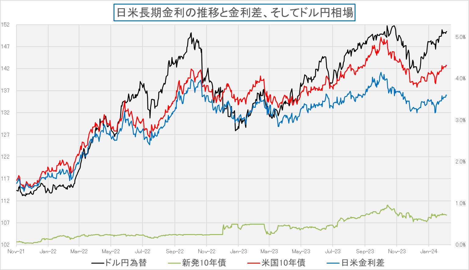 そしてどうやらドル円相場を見ていると、為替取引の方も、そうした実態を織込んだ動きになっているように思われる。下のチャートは、ドル円相場、米国10年債利回り、そして日本の新発10年債利回りの推移だ。少なくとも今月2月に入ってからのドル円相場の動き(黒線)は、米国10年債利回りの水準(赤線)そして日米の金利差(青線)にほぼほぼパラレルに動いている。強いて言えば、ドル円相場の方が、ややタカ派的に強含んでいるとも見える。その一方で、日本の長期金利である新発国債10年物の利回りは週末時点で0.715%。先月の水準よりは上昇しているが、日銀のYCCターゲットよりは遥かに低いところに留まっている。日経平均株価が最高値更新という煽りと、円安によって消費者が物価上昇に苦しめられているという言い立ては出来ても、実質GDPが2四半期連続でマイナスという現実の前には、ここで強引に日銀に金融政策の方向性を転換させるということは、日銀の命取りに繋がる話だ。価格変動分を除いた実質GDPは、純粋に数量効果であり、それがマイナスとは日本の生産が落ちているということに外ならず、「マイナス金利は異常な金融政策」というロジックだけでは崩せないと思う。少なくとも、2000年以降、拙速に利上げしたことで景気失速を2度も招いた当時(速水総裁時代、福井総裁時代)、日銀の審議役としてブレイン役だった植田総裁は見ていた筈だからだ。