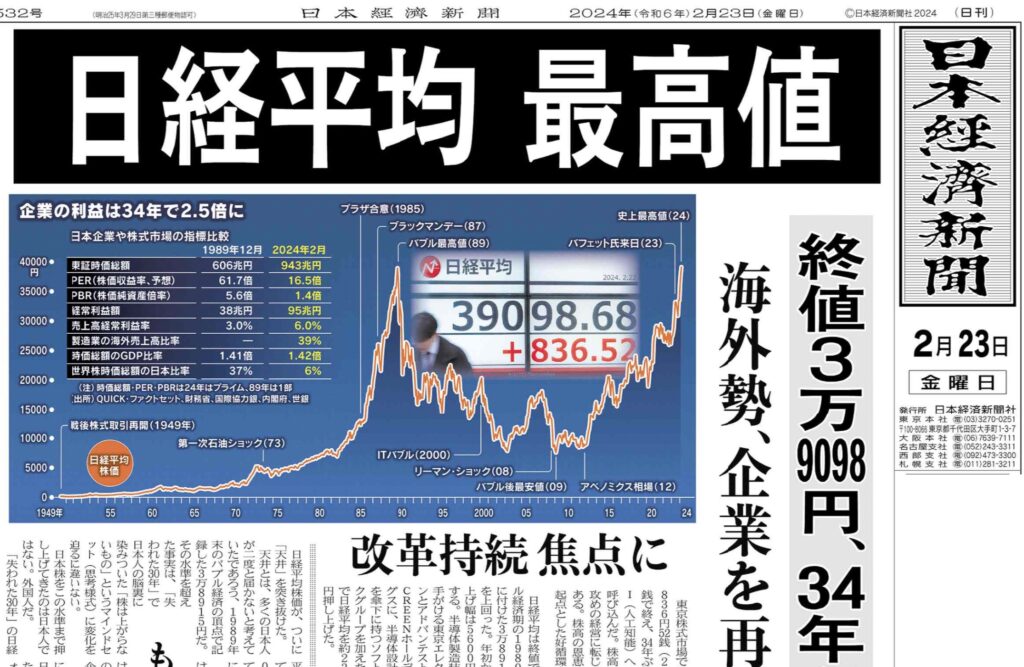 その最高値更新の大見出しが打たれた新聞の第一面、既に気がつかれた人もいらっしゃると思うが、見出しの下に、実はとても意味ある表が掲載されている。1989年12月当時と2024年2月の各種数値の比較だ。東証時価総額が1989年当時は606兆円に過ぎなかったものが、現在は943兆円、約1.5倍以上に拡大しているというもの。まさか失われた30年と喧伝され続けてきたこの時間軸に、当時の時価総額の半分に相当するあらたな日本企業が上場されて時価総額を膨らましたとは誰も努々思われまい。更に言えば、株価の時価水準のバロメーターであるPERは当時が61.7倍もあったのに対して、現在は16.5倍と約4分の一以下、PBRも当時の5.6倍から丁度4分の一の1.4倍に低下している。逆に言えば、バリュエーションが同水準に戻れるならば、日経平均株価は約4倍に相当する160,000円前後でもおかしくないということだ。本当はこれが意味することの方が余程大きいということを語る人は少ない。すなわち、34年前と同じ水準に日経平均株価が戻った2024年に再確認して見たら、日本は1989年12月当時に比べて「4分の一しか未来に夢を見れない国」になり下がったということにほかならない。そう、PERもPBRも、そのマルチプル(倍率)を決めるのは、投資対象として未来にどれだけ夢が見れるかどうかだからだ。将来、それだけの成長見込めて、価値を回収出来ると判断されるレベルがこれらのマルチプルを決めるということのインプリケーションは大きい。