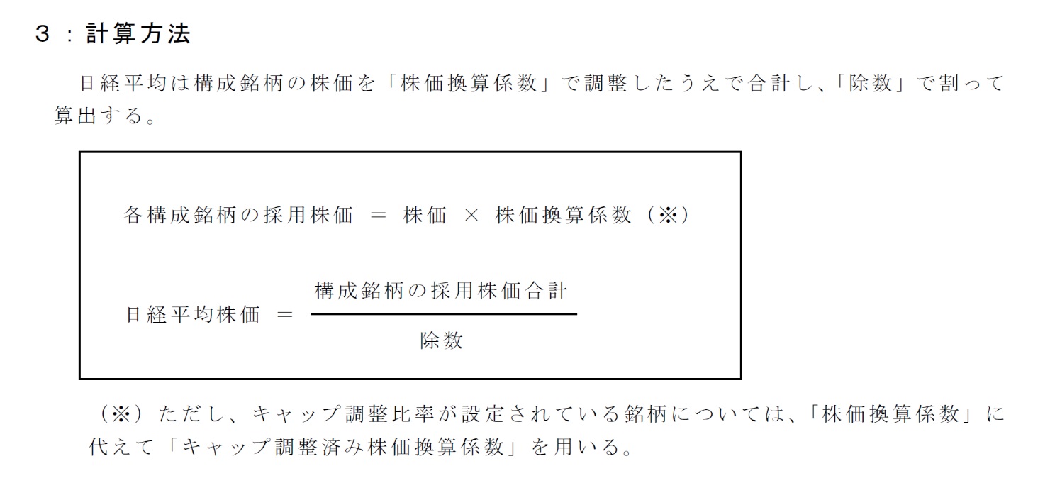 日経平均株価のかつての定義は割とシンプルだった。すなわち「日経平均採用銘柄225銘柄の50円額面換算の金額を単純に合計して225で割ったもの。但し、時系列の連動性を保つために「日経平均除数」という数値を使って、指数の連続性を担保する」というものだった。50円額面換算をしたのは、500円額面などの株式が登場したため。また無額面株式なども登場したことから、明確にうたわれていた。だが、その額面という概念が無くなったこと、1980年代の終わりに外資系証券会社を中心に先物売りと現物買いを合わせた裁定取引の規模を膨らみ、流動性が極端に低い一部値嵩株の指数影響が無視出来ない状態となったことで、1990年代以降に幾度となく見直しが行われ、今では、その算出方法は一見すると同じようにも見えるが、かなり違ったものへと変遷している。下記に正式な「日経平均プロファイル」の計算式部分をお見せする。違和感の源がお分かりになるだろうか。