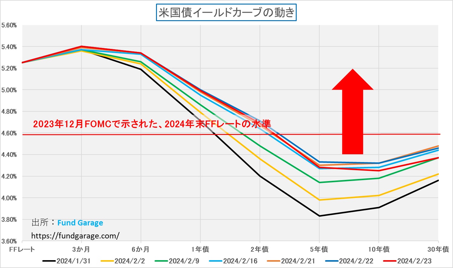 なぜこの問題に触れるかと言えば、先般来お伝えしてきたように、米国の長期金利は現物債の世界ではジワジワと上昇しているからだ。言い換えると、ドットチャートが示した2024年末のFFレートのあるべき水準とされる4.6%と仮定した場合に、あるべき水準の長期金利水準に向かって、ジワジワと水準訂正をしているということ。それでも株価も下落しないことがふたつ目のポイント。ただ、まだまだ逆イールドの状態であり、その意味では長期金利の上昇は事足りていない。恐らく、この先、米国景気の減速感が強まる(現状は減速していないことが確認されている)ことが無い限り、長期金利が再び4.0%の水準を下回ることは当分なさそうだ。下のチャートがその根拠となる。少なくとも、そうした水準訂正をCY2024になってから、市場の語り部たちの話とは別に、米国債現物を取引している投資家の動きは長期金利が上昇する方向に向けている。先週末はそれでもやや買い戻されて金利は4.32%から4.25%に低下した状態。昨年末に3.8%をも下回ったのとは雲泥の差だといえる。