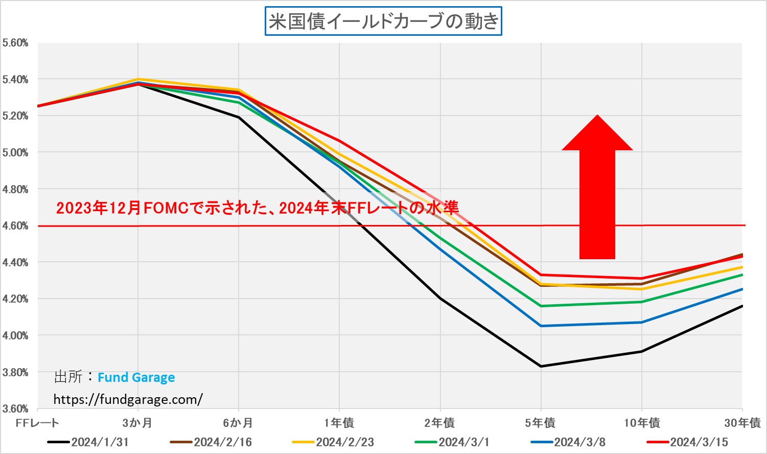 まずは米国金利がどう動いたかの確認から始めよう。下のイールドカーブの動きを見て貰うと一目瞭然だが、先々週3月8日の青線で示したイールドカーブから、一週間で赤線の先週末のそれまで、1年債よりも期間の長い米国債利回りはすべて上昇したのが確認出来る。1年債利回りが4.92%から5.06%へ14bp、2年債利回りが4.47%から4.73%まで26bp、5年債利回りが4.05%から4.33%へ28bp、10年債利回りが4.07%から4.31%まで24bp、そして30年債利回りで4.25%から4.43%まで18bpといった具合だ。0.25%を一度の政策金利の変更幅とするならば、軒並み約1回分の政策金利変更に相当するレベルで金利が上昇しているのがわかる。