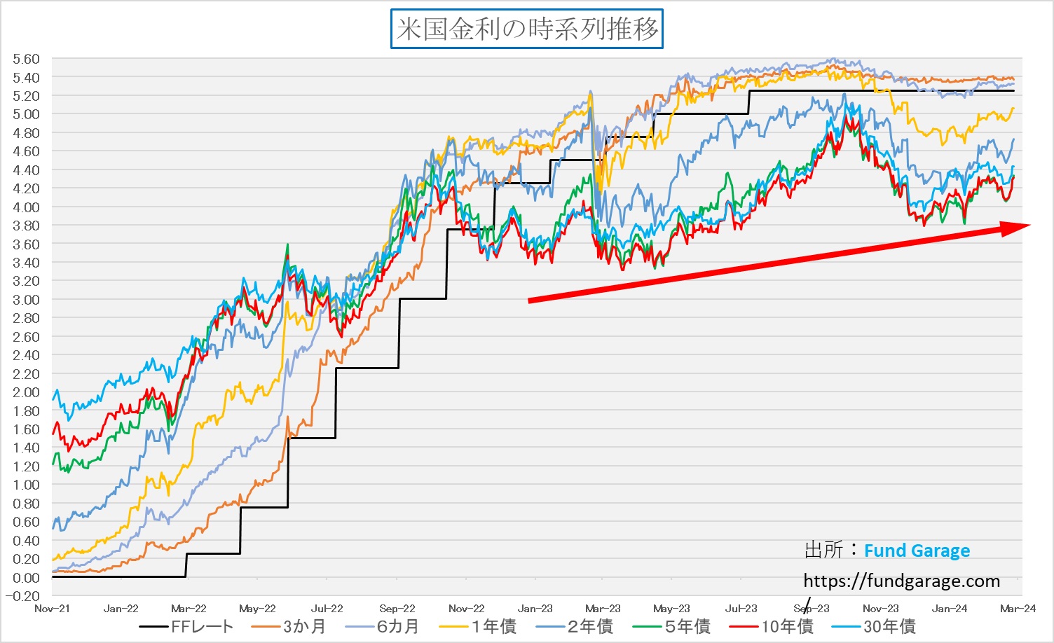 時系列の動きを更に確認してみると、更にはっきりと見えてくるが、赤い矢印でトレンドを示した通り、3カ月と6か月の短期金利を除き、下値を切り上げるように徐々に中長期の金利が上昇してきたのがわかる。このトレンド線が示していることは、すなわち市場が米国経済の動向に自信を持ってきたという証拠、言い換えると「リセッション懸念」は危惧で済みそうだという認識に変わりつつあることを示している。つまりソフトランディング・シナリオの確率が高まってきたという意味になる。これは間違いなく朗報だといって良いだろう。