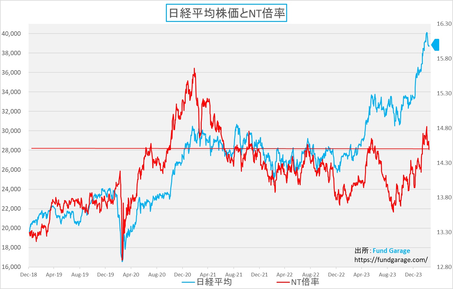 「エヌビディア3兄弟」は実際に「値嵩株3兄弟」でもある。これらが下落すれば、当然、その従妹やハトコの値嵩ハイテク株も下落するが、ご想像の通り、それは「ダウ式平均株価」である日経平均株価を効率的に押し下げる。下のチャートはNT倍率の推移だが、赤線で示されている通り、株価の下落以上にNT倍率が急落しているのが分かる。これは実に歪みを解消するためにもヘルシーな下げだと言える。実際、先週末15日のTOPIXに、日経平均株価が最高値40,109.23円を付けた4日のNT倍率14.82倍を掛けて日経平均株価を計算すると理論値は39,583.39円となる。これなら少々4万円台を下回ったという印象に変わるだろう。実際、日経平均株価が下落した週末15日のTOPIXは上昇している。これは為替の動きと、時価総額最大のトヨタ自動車(7203)の株価推移で説明出来る。週初、一旦は146円台まで円高に動いたドル円相場もそこからはじり高となり、週末終値は149.04円だ。トヨタ自動車(7203)の株価はこのところ笑ってしまうぐらい、ファンダメンタルズというよりは為替変動に連動する。だからこそ今でもPERで言えば10.49倍と日経平均全体の16.45倍よりも遥かに割安に放置されているのだろうが、これが日経平均株価の下落率は△2.47%の一方で、TOPIXが△2.05%に留まった理由だろう。