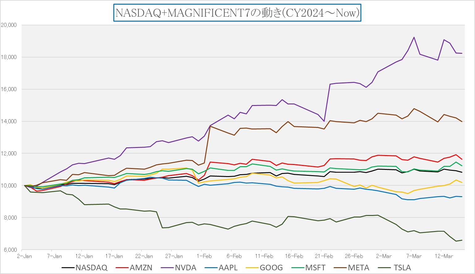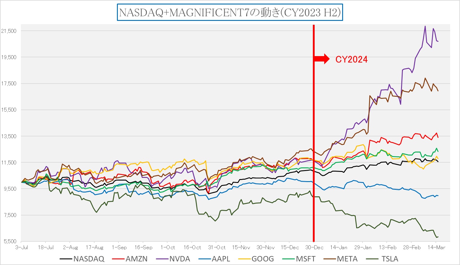 ファンダメンタルズの認識修正が行われている一方で、昨年CY2023と今年CY2024では「市場の風」が違っている。下のチャートはCY2023下半期となる2023年7月1日を基準日としてマグニフィセント7とNASDAQの相対パフォーマンスを比較したものだ。そして縦に赤線を入れた部分から右側になると、今年2024年となっている。CY2023の内から既にテスラが脱落し掛かって動いているのは明らかだが、それでも何となく7銘柄の動きは似たものとなっている。しかしそれが今年CY2024になってから明確に袂分けるかの如くに別々に動き出したのが確認出来る。ラインは一番右側を上からエヌビディア(NVDA)、メタプラットフォーム(META)、アマゾンドットコム(AMZN)、マイクロソフト(MSFT)、アルファベット(GOOG)、NASDAQ総合、アップル(AAPL)そしてテスラ(TSLA)だ。
