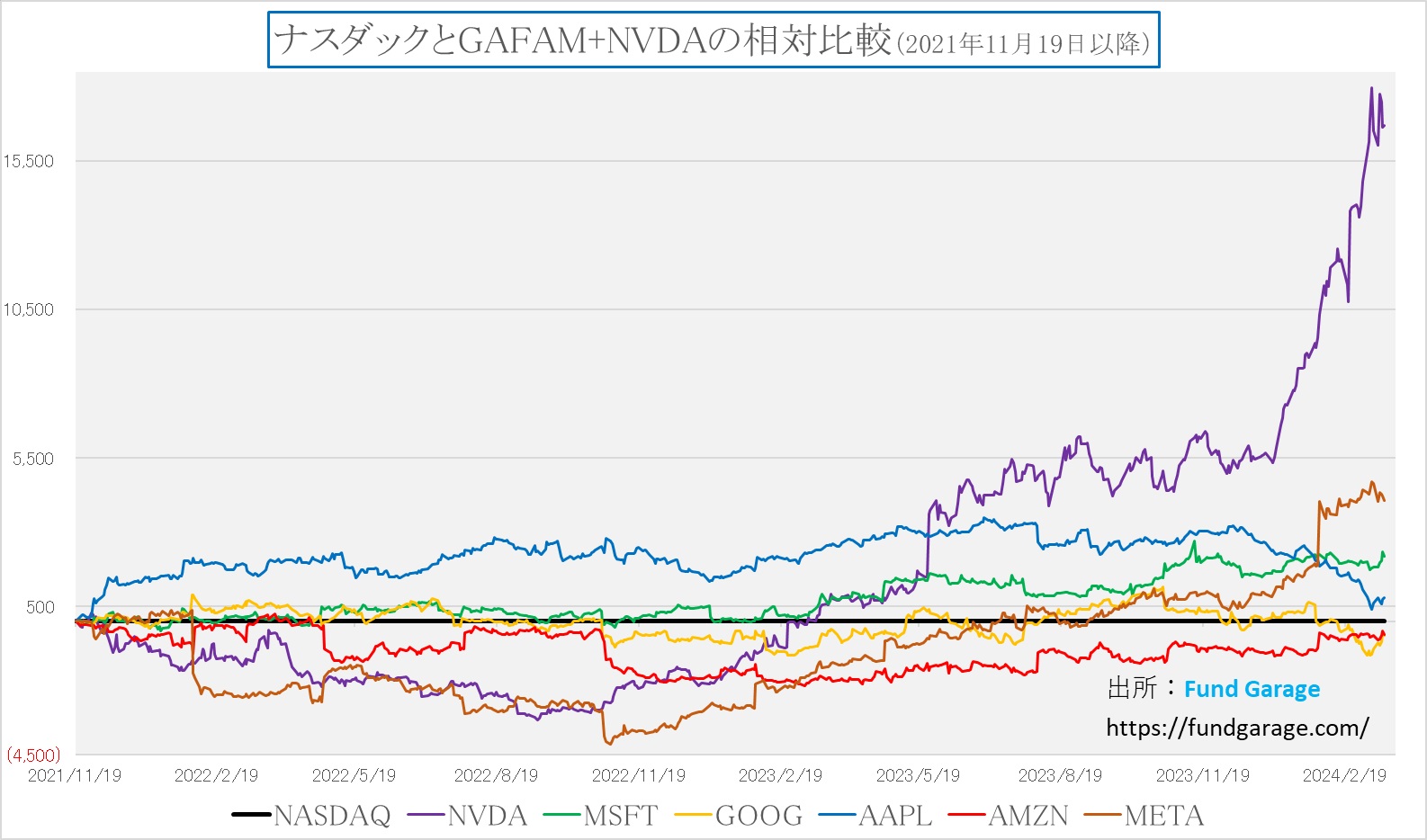 そんな時に必要になるのは、スピード調整だ。下のチャートは、NASDAQが前回史上最高値を更新した2021年11月19日以降の、マグニフィセント7(除くテスラ)とNASDAQ総合とのパフォーマンス乖離を示している。紫色で示したものがエヌビディア(NVDA)だが、2022年9月には、忘れられているとは思うが、最大33%もアンダーパフォームしていた。そのどん底から切り返し、そして現状では対NASDAQ総合で最大177%ものアウトパフォームとなっている。この状況を見れば、ここでそのスピード調整が入ることには何の疑問も無いだろう。市場がそのスピード感について行けないからだ。エヌビディアを含む30銘柄の時価総額加重平均で計算されるSOX指数が、先週、先々週と一番パフォーマンスが悪いインデックスとなったのはその為だ。ただ繰り返しになるが、過去の事例とは異なり、PERは上昇していない。