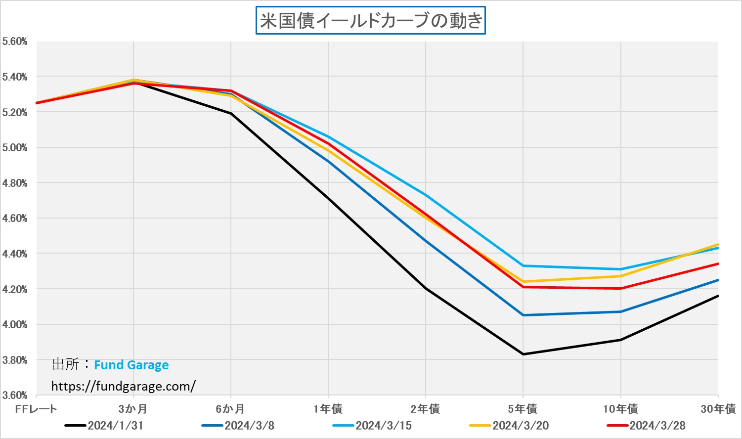 これを受けた米国金利の動きは下記のチャートを見て貰えば分かり易い。週末の水準を示したイールドカーブは赤い線。黒い線の1月FOMCの時に比べると、明らかにイールドカーブは上方シフトしているが、前回の3月のFOMC直前ほどにはタカ派にはなっていない。このまま利下げタイミングと、景気動向を見ながら、上手くソフトランディングしていくことを織込みに行くだろう。