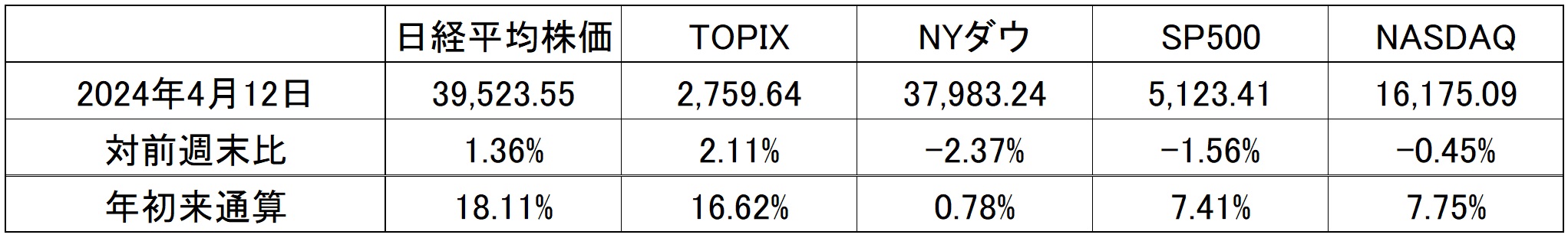 ただ先週末金曜日の米国市場の下落は、中東情勢を危惧するリスク回避による下落だけでは決してないので、そこは注意が必要だ。大きな理由を提供したのが実はJPモルガンの決算内容だ。ただ実はこれには伏線がある。新聞などでも報じられていたが、決算発表に先立ち同行のジェイミー・ダイモンCEOは、8日公表の株主への手紙で「我々は2%から8%、あるいはそれ以上の幅広い範囲内での金利変動や経済の結果に備えている」と強調したと報じられている。この内容には私は非常に違和感があった。そもそもどの期間の金利に言及しているのかも定かではないが、2%から8%の範囲と言えば5%を中心に上下プラスマイナス3%のレンジとあまりにもワイドレンジ過ぎるということ。つまり何がどうなるのか、このCEOはさっぱり読めていないということに等しいからだ。実は更に伏線がある。ダイモンCEOは昨年10月13日、第3四半期決算の発表(市場予想を僅かだが上回った)に際して「ウクライナでの戦争は、先週の(ハマスによる)イスラエルへの攻撃と相まって、エネルギー、食料市場、世界の貿易、地政学的関係に広く影響を及ぼす可能性がある。世界は過去数十年で最も危険な時期を迎えているかもしれない」とコメントし、その後も一貫して米国経済の見通しについては悲観的だった。従って、「利下げに対する期待値」が低下するような現下の予想以上に強い米国経済の実情は、恐らくダイモンCEOの思惑とは正反対になった筈だ。総司令官の経済見通しの根幹が間違っているとすれば、当然、企業経営が上手く行く道理も無いが、今般発表された決算内容は、まさにその誤りを映し出すかのように純金利収入が市場予想を下回り、しかも不思議なことに通年の経費見通しを引き上げるという酷いものだったからだ。従って、ある意味では個別事由によるものとも言えなくはないが、全米最大の銀行の決算、当然NYダウには大きな影響を与える。全米最大のJPモルガン・チェースの株価下落は市場のマインドセットを冷やすのには充分な役回りと言える。結果、週を通じた各市場の騰落率では、NYダウが突出して悪いことがわかる。