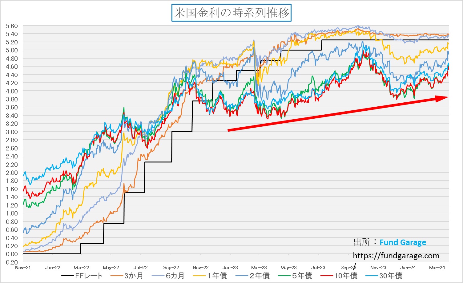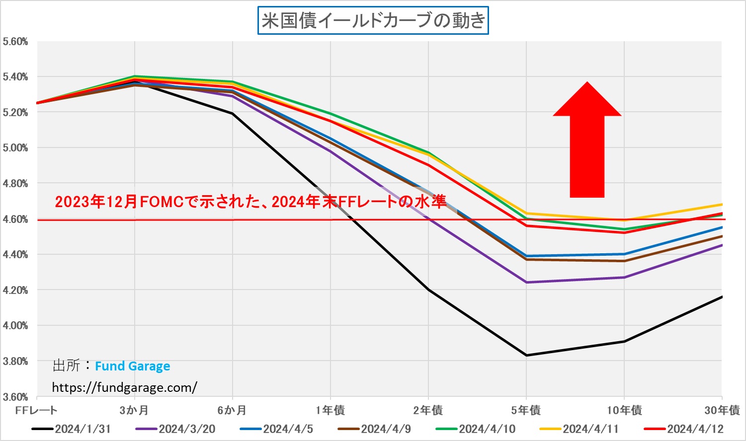 まずは先週末までのイールドカーブの状況を確認しておく。ご覧頂ける通り、もう少しでFOMCで3カ月毎に公開されるドットチャートが示す2024年末のFFレートの水準4.6%まで、あと一歩のところまで金利は上昇してきた。仮に予定通りにFOMCで年内に利下げが行われていけば、イールドカーブはフラットになる状況に近付いてきたと言える。