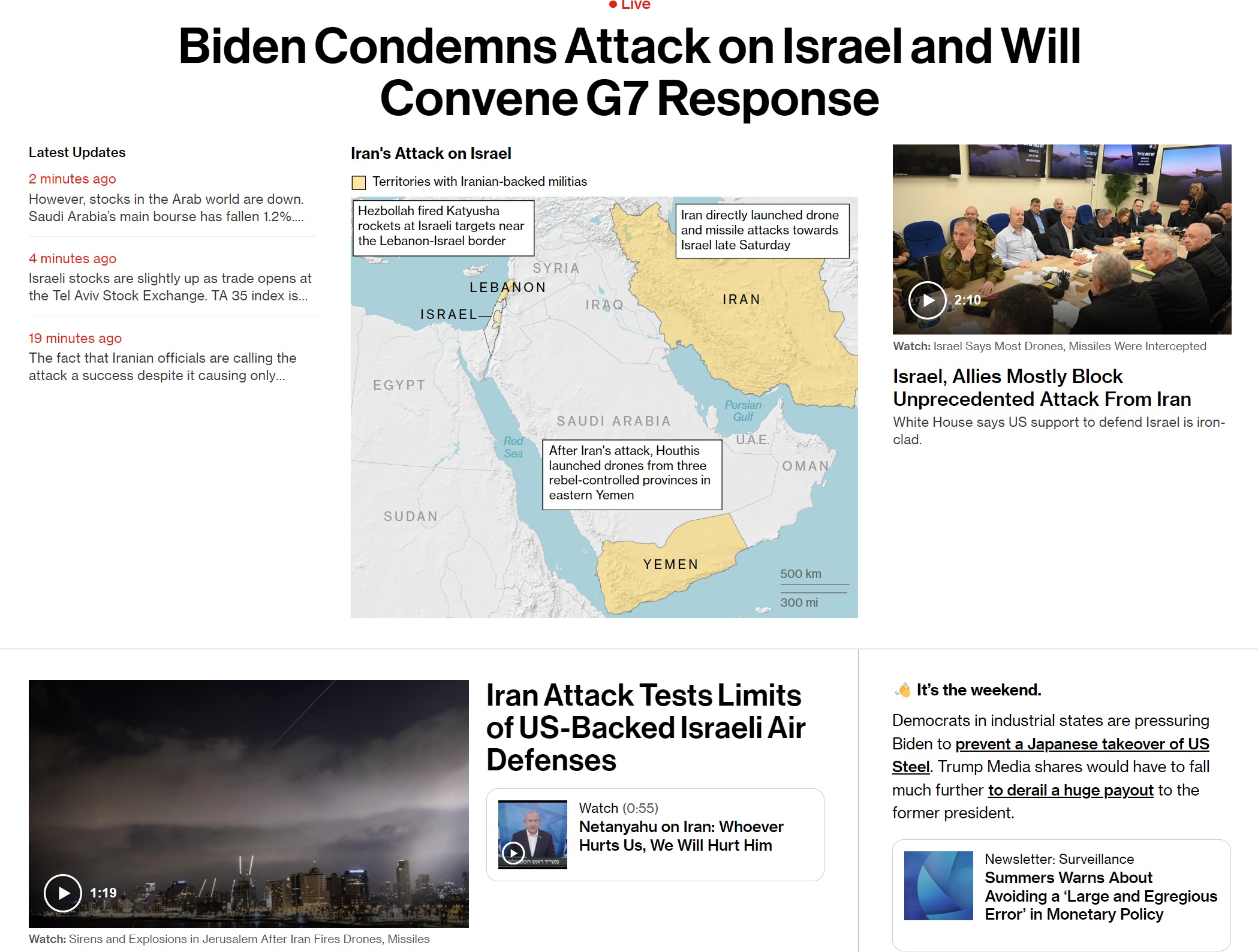 そろそろ本稿を脱稿するタイミング(PM4:30)だが、今現時点でBloombergの英語版のトップページはこんな感じだ。タイトルは「バイデン大統領はイスラエルへの攻撃を非難するとともに、G7対応を招集」とでも訳そう。ロシアのウクライナ侵攻に加えて、目をつぶって意図的に見ないようにしてきた不安が現実のものとなって目の前に立ち塞がりつつある。ここから先の道筋は全く予断は許さないだろう。