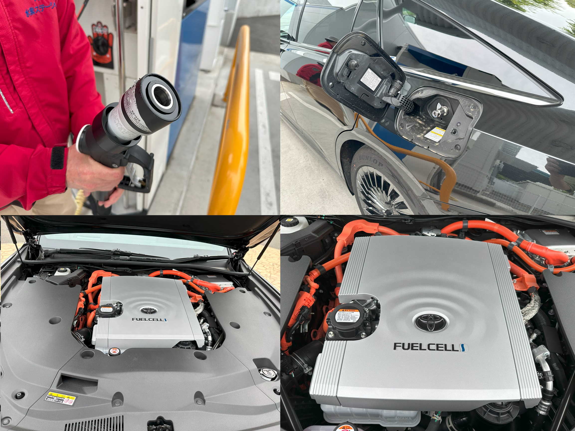 実際に給水素をしているところを横に張り付いて見ていたが、作業は実に簡単に終わる。左上の写真にあるガソリンのノズルと似たものを、給水素口に差し込む。この段階でノズルの先にあるセンサーがタンク口のそれと通信を行い、安全確認と給水素可能量を確認する。また水素ガスはマイナス35度以下で補填することが安全上義務付けられているようで、そうした確認などが自動で行われる。上段右の写真がクルマ側の給水素口だ。