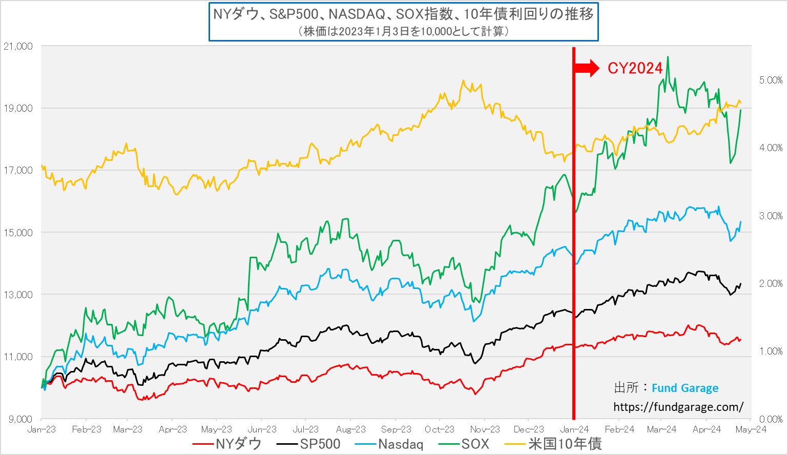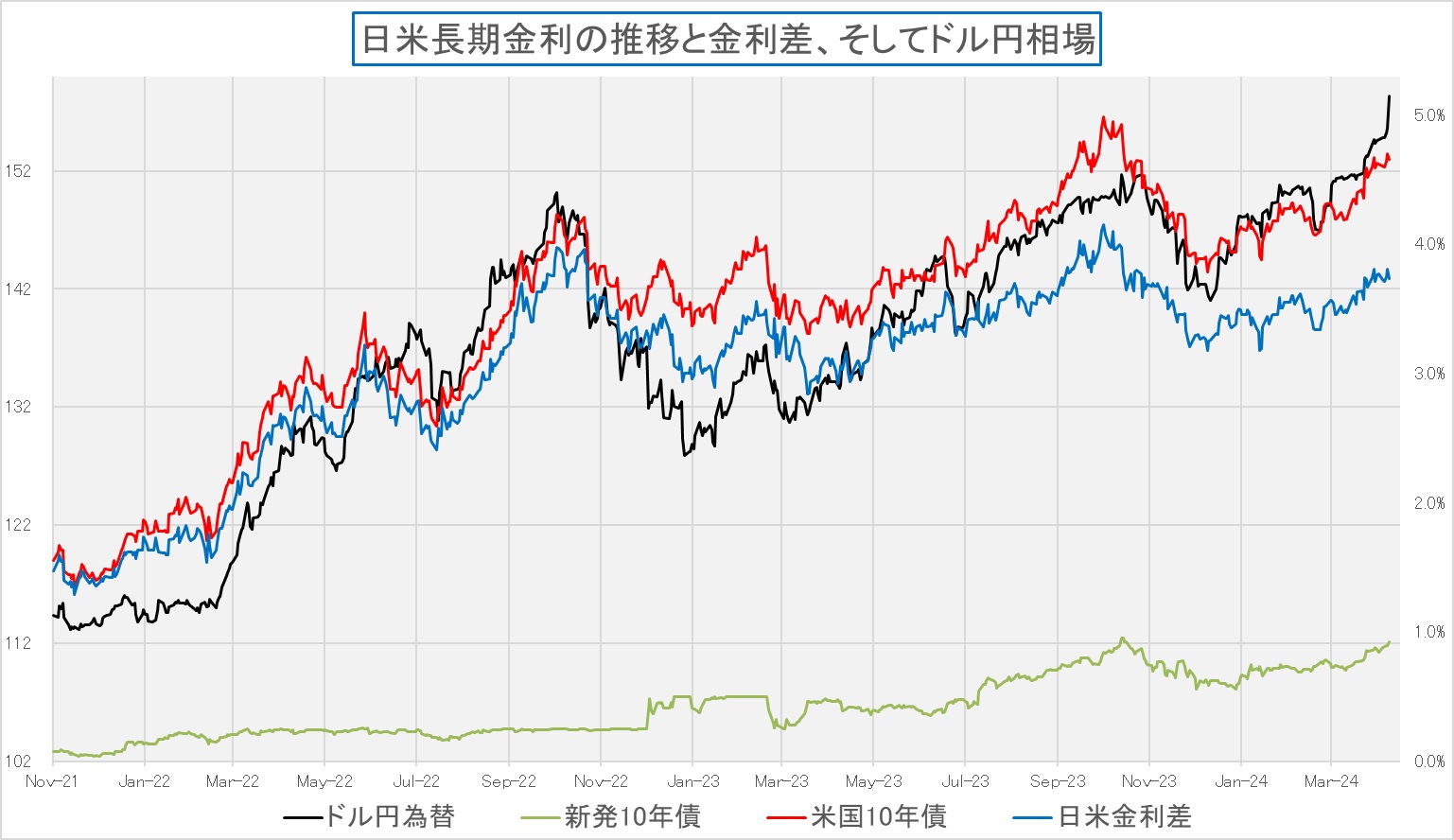 前述の論陣をサポートするためにも、このチャート、長期金利と米国主要株価指数の時系列変化のいつものものそ再提示させて頂く。2023年年央から一旦は長期金利と株価の変動は負の相関、すなわち金利が上がると株価は下がり、金利が下がると株価が上がるという関係だったのは事実。だが、今年に入ってから、金利は年末をボトムに切り返しているが、株価も基調として上昇している。先々週、TSMCやASMLの決算を受けて、高所恐怖症気味の投資家達の売りが一旦は下落を誘ったが、見事に先週は切り返したこともお分かり頂けると思う。もちろん、今週、再度下落になる可能性まで否定することは出来ないが、そのロジックを組み立てるのはやや難しいと思う。