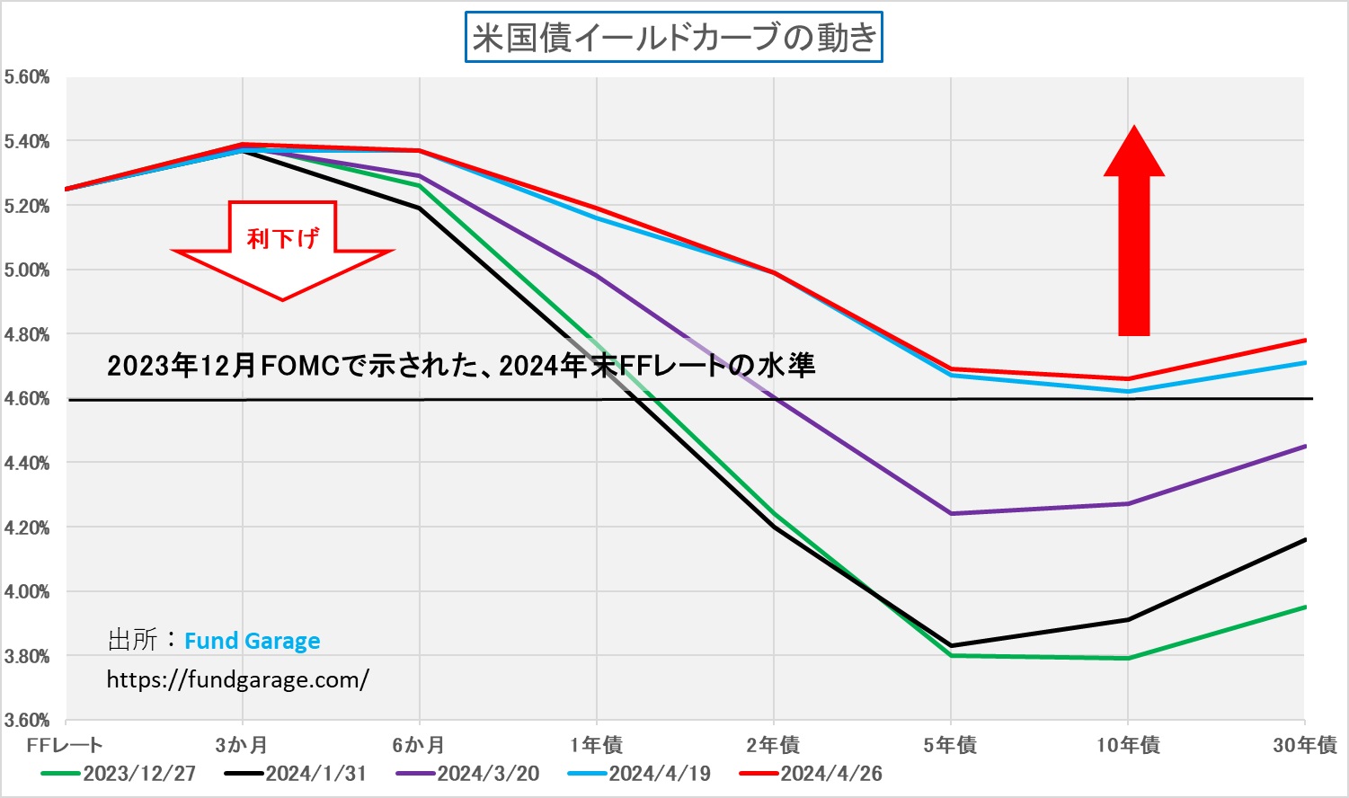 何本か線があるが、凡例で示している通り、これは昨年末、1月のFOMC、3月のFOMC、前週末4月19日、そして先週末4月26日のそれだ。漸く、4.6%の水準を長期金利が超えてきた。そして短期金利の方は、今現在証跡として示されているFOMCのドットチャート上の4.6%まで下がると想定されている。これこそ、順イールドへの道であり、粘着質なインフレを残しながらも、米国景気のファンダメンタルズの強さに併せて長期金利が上昇している様だ、と解釈することが出来る。なぜ、長期金利が順イールドになるように上昇して、楽観的過ぎる6回の利下げ予想が覆されそうになると、「スタッグフレーションがやってくる!」というネガティブ・トーンに変わるのか、正直言って意味が分からない。