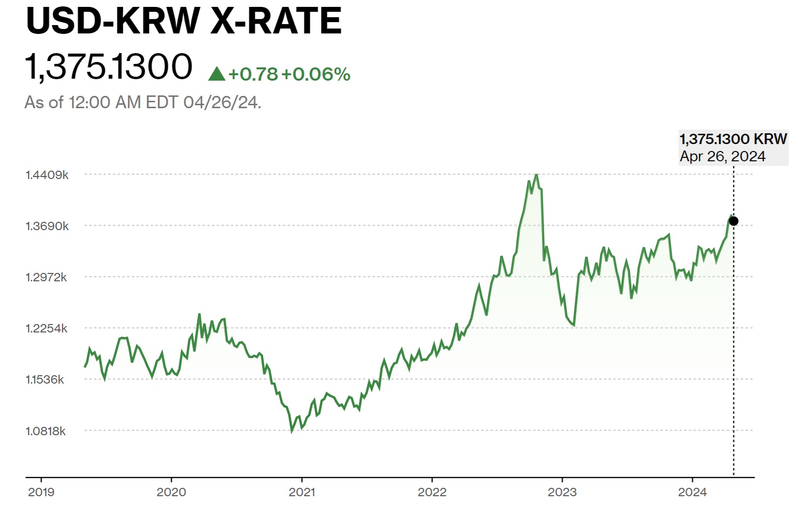 今週で米国企業の決算発表は峠を越える。その最中にFOMCがあるが、元々5月は「スルー」になるだろうと予想されるだけに、今回何か大きな動きがFOMCに絡んで起きるとは想定していない。また「スタッグフレーション」の話などを持ち出す人達の中には、「利下げ」ではなく、「FOMCが利上げに転じる」などと”暢気”に語る人も居るが、正直、有り得ないと思われる。今ここで米国が利上げをすれば、新興国で通貨危機が起こりかねないからだ。日本は円安に振れても通貨危機に陥るほど脆弱な財政基盤では全く無いが、韓国などは結構厳しい状況に追い込まれているのは確かだ。かなりなウォン安ドル高に既になっている。下のチャートでお分かりの通り、2022年に「韓国通貨危機か?」と怯えた水準が、もうそこまで来ている。