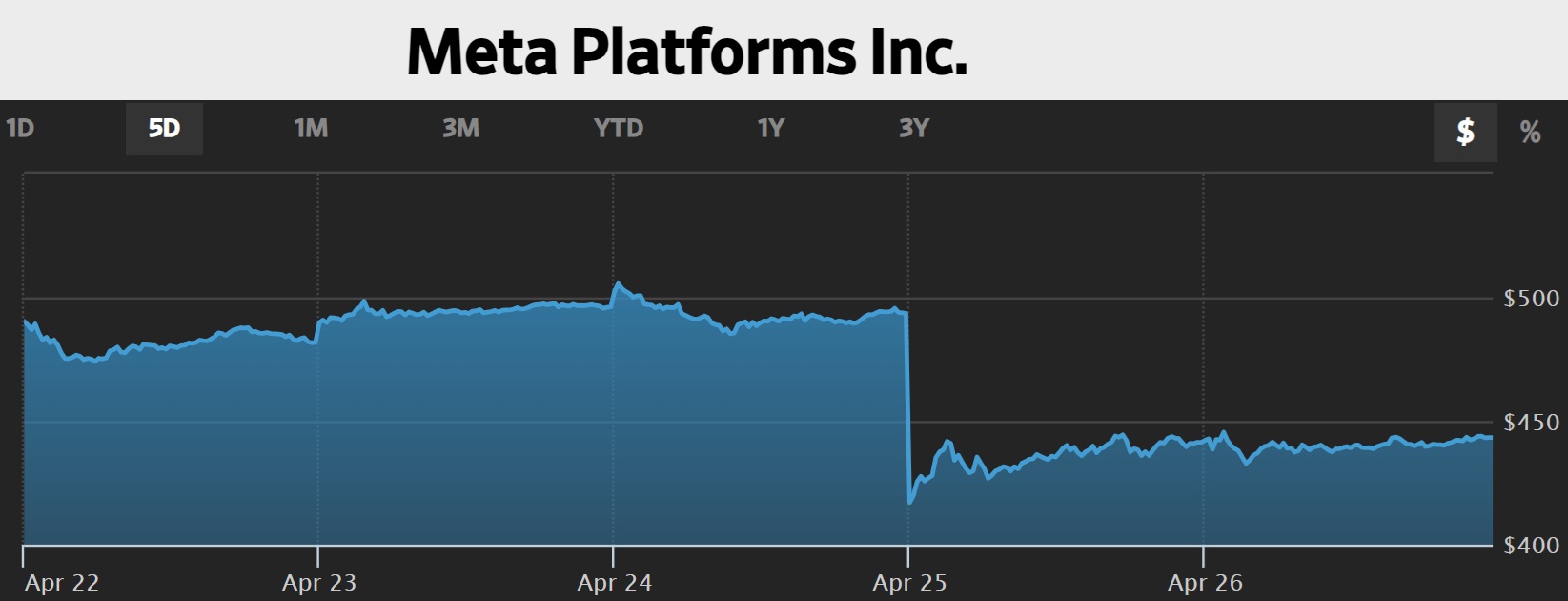 「まあ、市場なんてそんなもんだ」と溜息をつきたくなるほど、メタプラットフォームズの決算は市場で好感はされなかった。下の週間の株価推移のチャート、真ん中にある「アイガー北壁」のようにそそり立った壁が株価急落の証だ。
