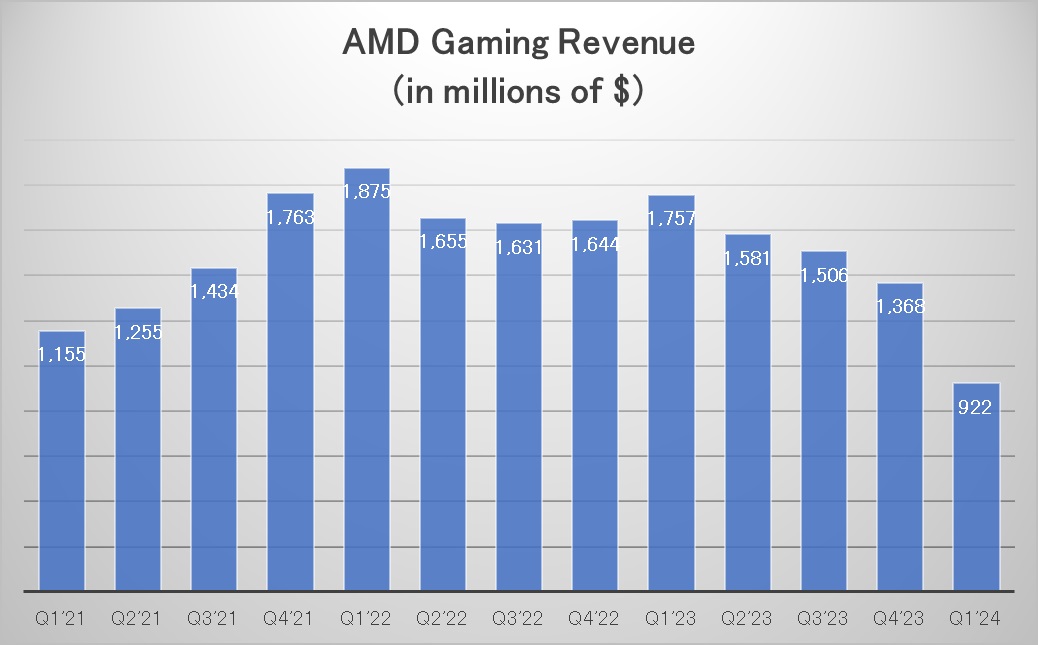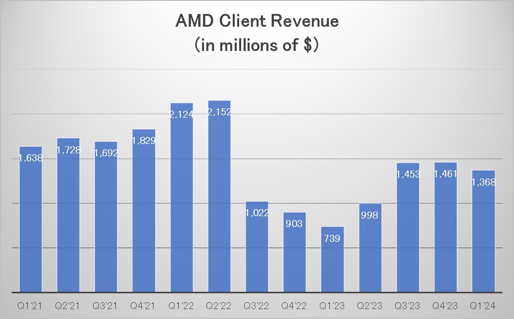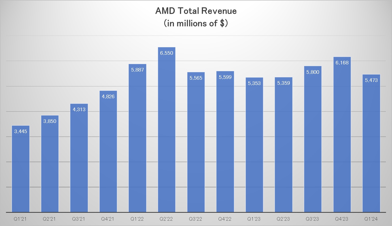 まず売上トレンドには季節性があるということを大前提として理解しておく必要がある。下のチャートは、AMDの四半期毎のTotal Revenueを示すが、これを見てどう思われるだろうか?まず前四半期Q4’23と比較した場合、約62億ドルから約55億ドルに売上が減少しているように見える。折角その前まで「4四半期連続で増収だったのに」と嘆かれる人もいるかも知れない。勿論、そんな季節性などなく、常に四半期毎に右肩上がりになればより素晴らしいことは事実だが、AMDサイズにまで大きくなった会社はそうはいかない。比べるべきは、前年同期比がまず基本となる。だとすると、比較すべきはQ1’23の約53.5億ドルであり、全体で約2.2%の増収となったことがわかる。この全体観を持ったうえで、先程の各セグメント別の動向を見るというのが基本作業だ。