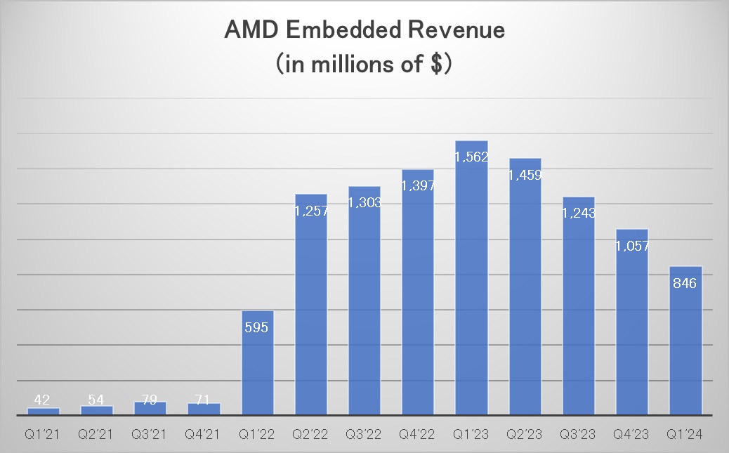 AMDが発表した第一四半期決算は、EPSにおいても、売上げにおいても、実績は市場予想を超えていた。また2024 年の第 2 四半期のガイダンスについても、売上高が約 57 億ドル、プラスまたはマイナス 3 億ドルとの予想だったので、市場コンセンサスの 56 億 9000 万ドルに対しては僅かながらもポジティブなものとなった筈だが、市場反応はネガティブなものとり、翌日の本市場で△9%近い下落となった。恐らく、この決算内容については、きちんと精査出来る人でないと、すなわち単純なアルゴリズムのプログラム取引など、決算発表後の時間外取引を動かすような短期売買筋の解釈だと誤解を招くことも多いだろうと思う。何故なら、AMDのビジネスフィールドが、エヌビディアのように最早AI向けのGPUだけ、インテルのようにパソコンやサーバーのCPUだけ、クアルコムようにスマホ向けCPUだけ、マイクロンテクノロジーのようにメモリーだけ、というほど単純ではないからだ。言い換えると、「AI向けGPUの王者エヌビディア」とか、「元Wintelの覇者インテル」と言った分かり易い枕詞をつけにくい、言ってしまえば「半導体のコングロマリット」のような会社だということだ。