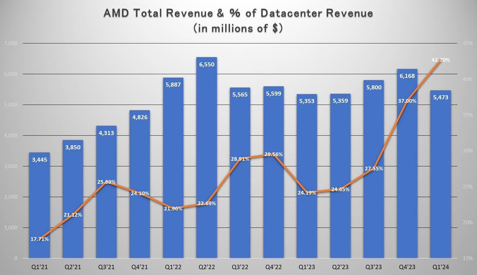 このチャートは総売上高の四半期毎の推移と、データセンタの売上比率を示したチャートだ。前述のように、或いは個別にセグメントの状況を見て貰ったように、今期のAMDの決算を支えたのは総売上高の42.7%もの比率を占めるまでになったデータセンタであることは間違いなく、この比率はCY23以降、AIインフラの市場ニーズに合わせて急成長してきたことがわかる。またもうひとつ明らかなことは、AMDがMI300というデータセンタ向けGPU(エヌビディアのH100の好敵手)はQ4’23の終わりからの売上貢献であり、この2四半期未満で累計10億ドルになったものが、今年CY2024の残り3四半期を合わせて40億ドル以上になるという。恐らく、この数値自体は上方修正される可能性が高い。