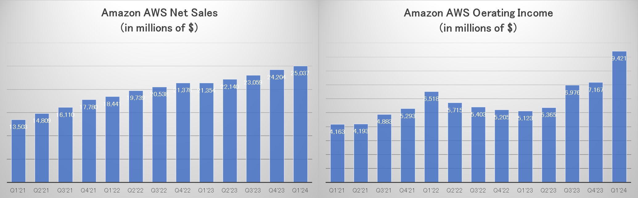 まずは他のセグメント同様、AWSの売上推移と営業利益の推移を確認しておこう。一目で明らかな通り、AWSの売上は間断なく右肩上がりに増加しているのがわかる。この分野に季節性は無いという理解は正しくなく、純粋にニーズが途切れることが無かったと言っていい。それを証明するのが右側の営業利益だ。このQ1’24の対前期比でも+31.45%なった数字を見て称賛する人は多いと思うが、ご覧頂ける通り、Q2’22から少なくとも5四半期はウォール街から理解を得ることは難しかった。そしてこの頃のアマゾンも今と変わらず「カスタマーエクスペリエンスが最優先」の企業で、どんなにアナリストにネガティブなコメントをされようとも一顧だにしなかった。ただ、古くからの株主はその真意を理解しており、行方を静かに見守っていたという感じだ。そう、そして現在の無敵で最強のCSP(クラウドサービス)であるAWSが誕生した。